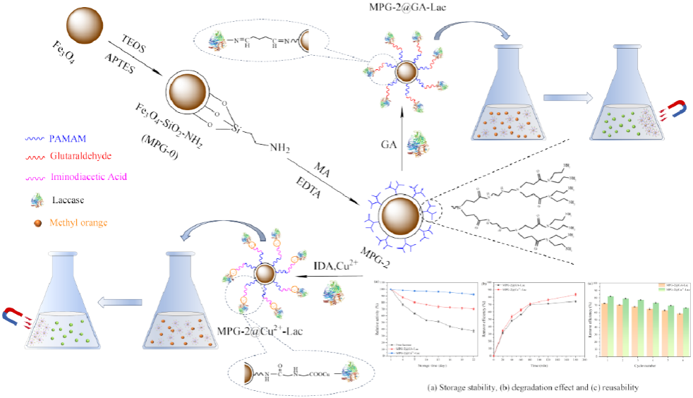 近期,2026世界杯官方合作网站潘虹博士团队在漆酶固定化载体的制备、固定化漆酶构建及性能优化和应用研究方面取得系列重要进展。课题组围绕游离漆酶稳定性差、难以回收的弊端长期制约着其工业化应用等行业痛点,设计开发了系列磁性树状大分子载体,通过多种方法构建固定化漆酶,相关研究成果发表于国际期刊。在传统的染料废水处理中,甲基橙作为典型的难降解有机污染物,一直是治理的重点与难点。虽然漆酶作为一种绿色...