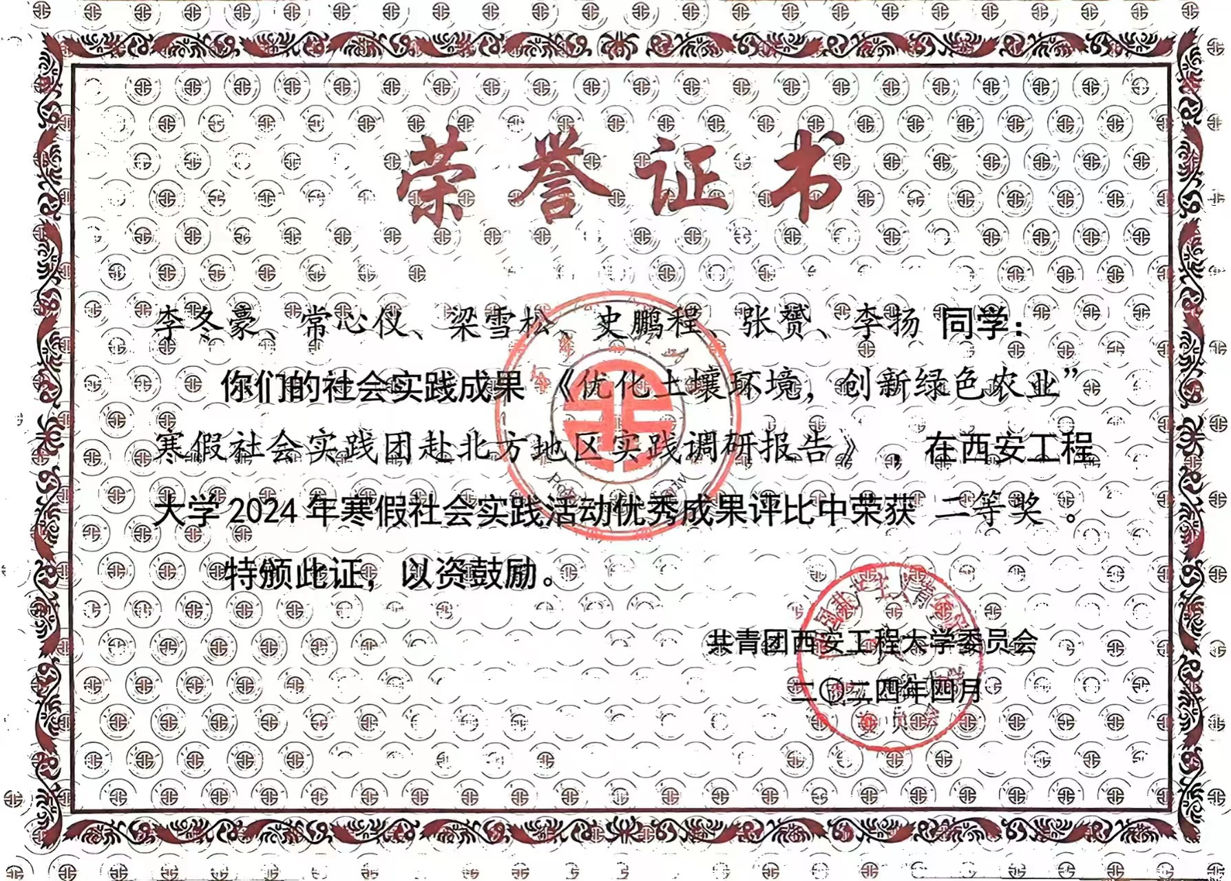 近日,2026世界杯官方合作网站2024年寒假社会实践活动的评选结果揭晓,公司“优化土壤环境,创新绿色农业”社会实践团队在众多参赛队伍中脱颖而出,荣获优秀服务队和优秀成果。“优化土壤环境,创新绿色农业”团队由我公司李冬豪同学带队,队员有常心仪、梁雪松、史鹏程,张赟同学,其中,常心仪和张赟同学荣获“先进个人”的称号。团队指导老师何艳慧老师。