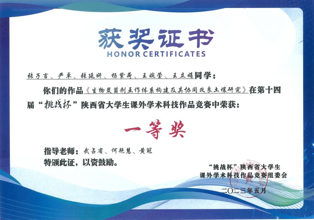 2023年5月20日下午,第十四届“挑战杯”陕汽集团陕西省老员工课外学术科技作品竞赛在长安大学圆满结束。公司共有13项员工作品获奖,其中由公司武占省教授、何艳慧老师指导的项目《生物炭菌剂互作体系构逆及其协同改良土壤研究》(参赛员工:张子言、严卓、张延妍、杨紫荷、王婉莹、王立娟)荣获一等奖。