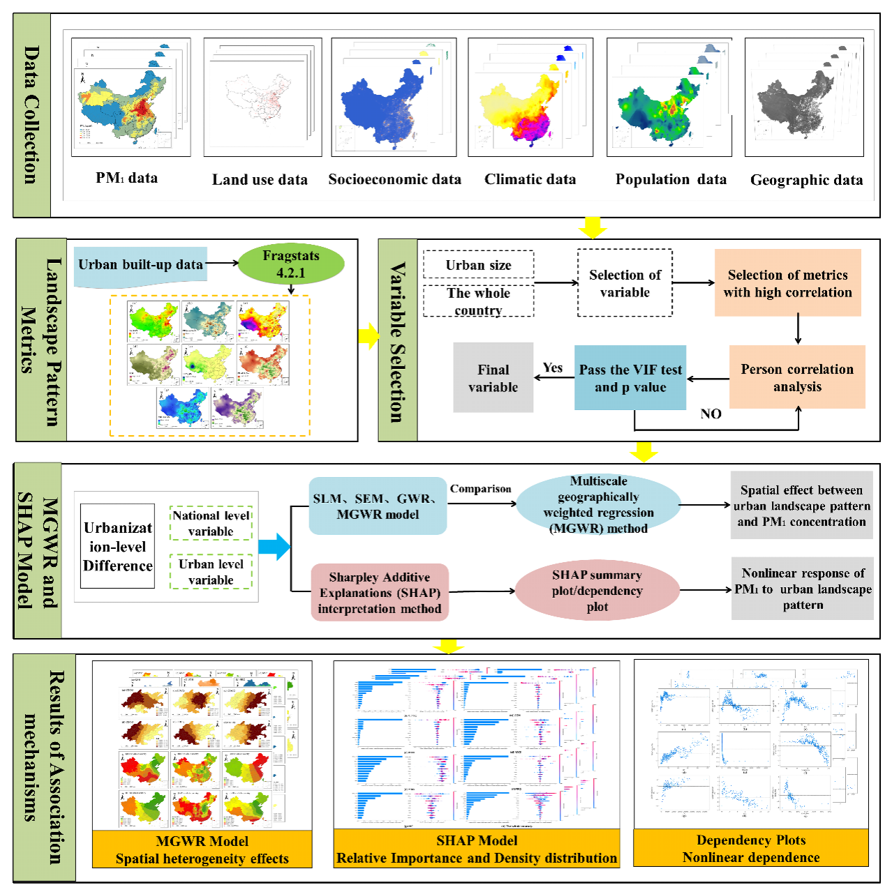 城市景观格局是大气污染物的排放源和影响因素的空间载体,对大气颗粒物(PM)污染产生影响。然而,很少有研究考虑城市景观格局对PM1浓度的空间非平稳性效应和非线性影响。本研究集成多尺度地理加权回归模型(MGWR)和Shapley加性可解释机器学习方法(SHAP),在国家与城市群尺度上探索景观格局对PM1浓度的空间异质效应、相对贡献程度和非线性依赖关系。结果表明城市景观格局与PM1污染密切相关,具有明显的空间差异。城市建成区无序扩张与不规则的城市形态将加剧PM1污染,而城市破碎化与连通性具有削减作用。分散的景观格局可以有效降低长三角(YRD)、珠三角(PRD)和成渝(CDCQ)地区的PM1浓度,而紧凑且连续的景观指数对缓解京津冀(BTH)和关中平原(GZH)城市群的PM1污染具有积极作用。城市景观格局与PM1污染之间的关系在城市群中体现更强烈。ENN_MN是特征重要性最强和可解释程度最大的景观指数。与其他景观指数相比,城市形状指标与PM1浓度之间的阈值效应关系更复杂。这些关键知识为深入理解PM1污染与景观格局之间的关联机制、城市可持续规划和大气污染调控提供科学依据。该成果以“Investigating the multiscale associations between urban landscape patterns and PM1pollution in China using a new combined framework”为题,发表于Journal of Cleaner Production(2024,456,142306)期刊上,论文第一作者为公司2021级硕士生朱慧敏,通讯作者为张平博士。