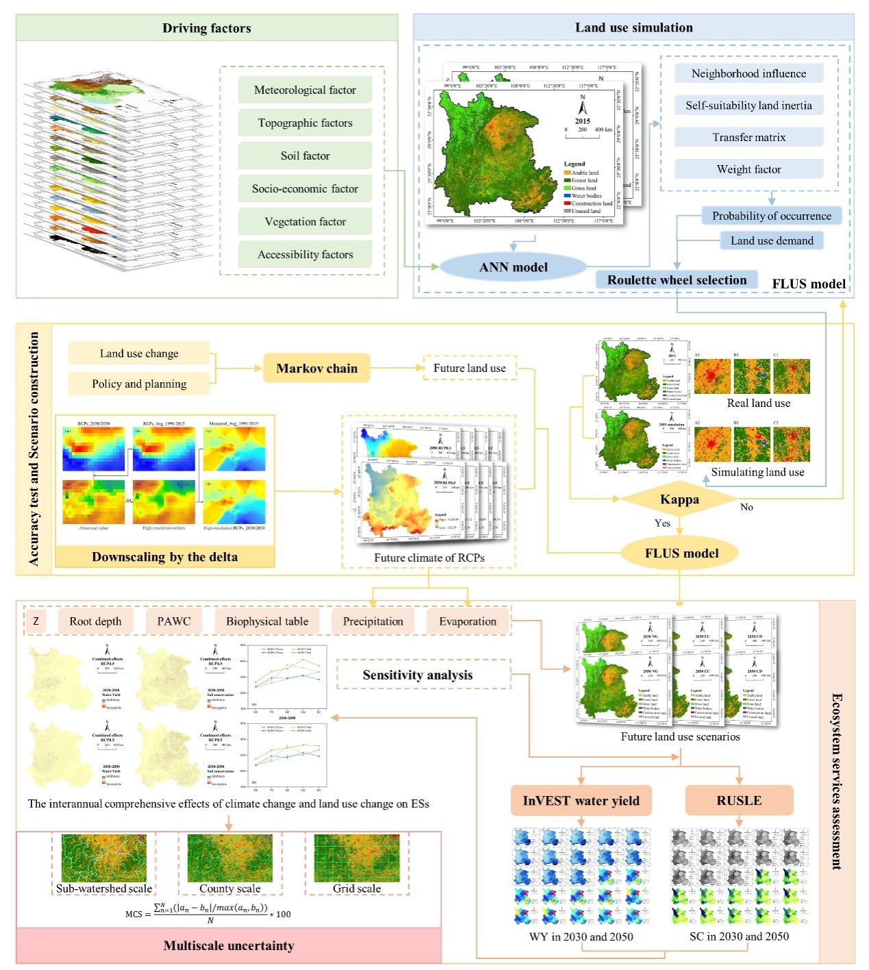 探讨未来土地利用(LUCC)和气候变化(CC)对水相关生态系统服务(WRESs)的影响对于可持续的城市生态系统规划至关重要。然而,很少有研究考虑到未来不同CC和LUCC对WRESs的相对贡献和综合影响,LUCC和CC对WRESs的未来影响的多尺度不确定性仍不清楚。本研究提出了一种整合BNU-ESM、FLUS和InVEST模型的新框架,探讨了CC和LUCC对西南地区产水量(WY)和土壤保持(SC)的相对贡献和综合效应,并利用制图比较统计(MCS)方法进一步量化了多尺度不确定性。在未来情景中WY总体减少,但SC先减少后增加。CC对WY和SC的贡献分别在84.23%和91.76%以上,但LUCC的影响随时间的推移不断扩大。LUCC带来的不确定性较小,CC较大,年际变化导致的不确定性最大。不确定性有着明显的尺度依赖性,但在不同尺度上保持相对稳定。这些关键知识可用于应对未来的气候变化风险、优化土地利用空间格局以及实施跨尺度的可持续生态系统管理。该成果以“Assessing the relative contributions, combined effects and multiscale uncertainty of future land use and climate change on water-related ecosystem services in Southwest China using a novel integrated modelling framework”为题,发表于Sustainable Cities and Society(2024,106,105400)期刊上,论文第一作者为公司2021级硕士生马雪楠,通讯作者为张平博士。