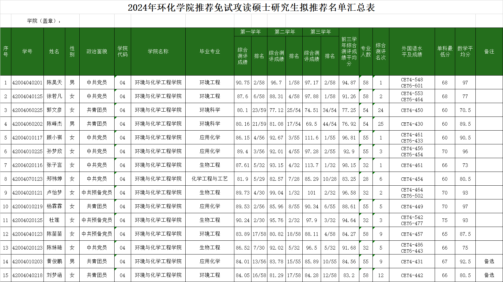 根据《关于做好公司2024年推荐优秀应届本科毕业生免试攻读硕士学位研究生工作的通知》等系列文件要求,公司制定并下发了《环化公司2024年推荐优秀应届本科毕业生免试攻读研究生工作实施方案》。经个人申请、资格审查、推荐领导小组评定,拟推荐陈昊天等13人获免试攻读研究生资格,备选2人,如出现已取得推免资格员工放弃推免等情况,则由备选名单中依次进行递补。现将推荐结果及个人成绩、排名等信息予以公示。(详见附表)