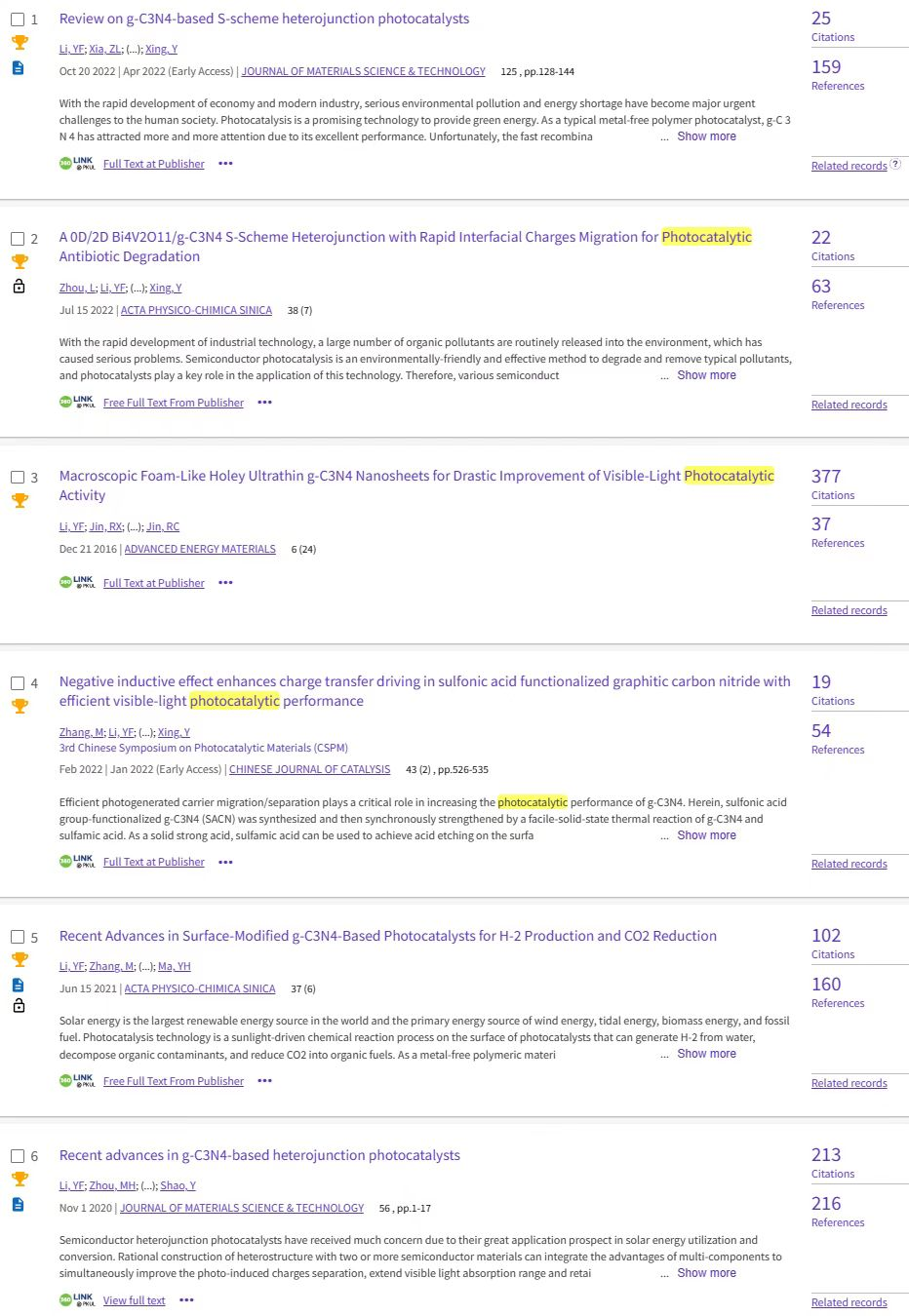 近日,科睿唯安(Clarivate Analytics)公布了Essential Science Indicators(简称ESI)数据库最新统计结果,公司李云锋教授课题组6篇论文入选ESI高被引论文Top 1%,论文第一作者分别为公司2019级硕士研究生周亮、张敏,2020级硕士研究生夏志玲等。这些成果主要围绕半导体光催化材料在环境与能源领域中的应用基础研究开展,针对传统光催化剂量子效率低、太阳能转化率差等关键科学问题课题组进行了系统的研究工作。