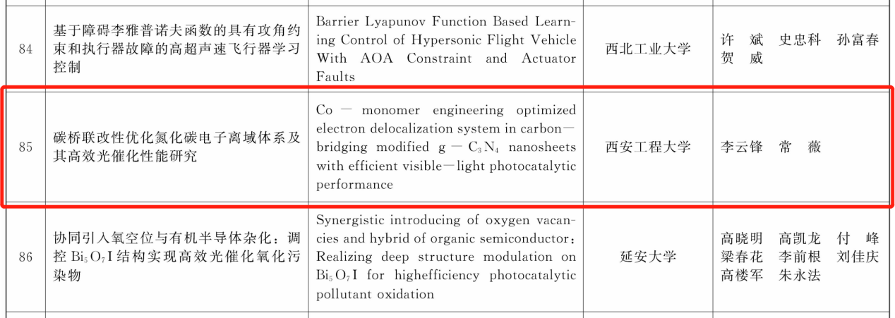 近日,陕西省人民政府发布《关于表彰第十五届自然科学优秀学术论文的通报》(陕政字〔2022〕80号),在全省范围内共选出160篇学术论文,每三年评选一次,其中一等奖10篇、二等奖50篇、三等奖100篇。公司李云锋教授、常薇教授申报的《碳桥联改性优化氮化碳电子离域体系及其高效光催化性能研究》入选陕西省第十五届自然科学优秀学术论文三等奖。