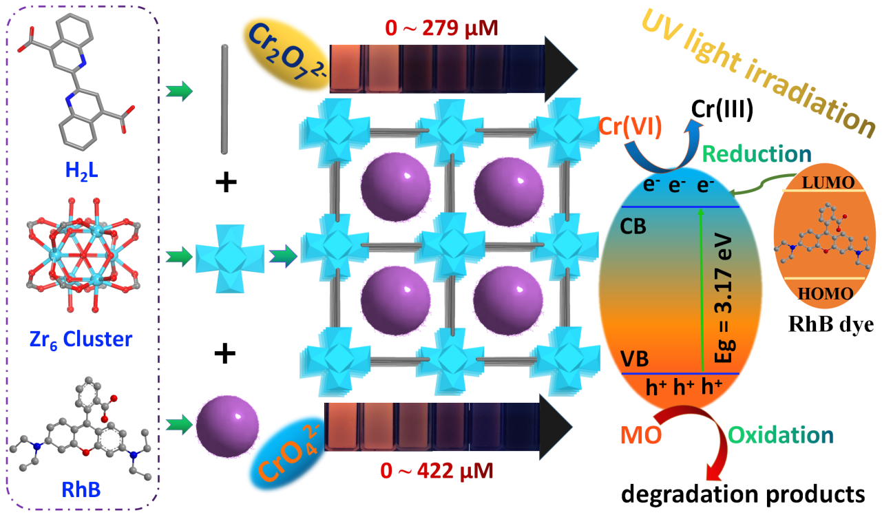 近日,公司材料化工团队李庆副教授课题组针对在水环境化学中发挥重要作用的Zr-MOFs作为光化学探针和光催化剂时,其灵敏度、选择性和光敏性方面存在的技术瓶颈,开展关键科学、技术问题研究并取得新进展。相关研究成果以“RhB-Embedded Zirconium–Biquinoline-Based MOF Composite for Highly Sensitive Probing Cr(VI) and Photochemical Removal of CrO42-, Cr2O72-, and MO”为题发表于无机化学领域国际顶级期刊《Inorganic Chemistry》上(Inorg. Chem., 2022, 61, 15213–15224.中科院一区, IF = 5.436, Top期刊)。