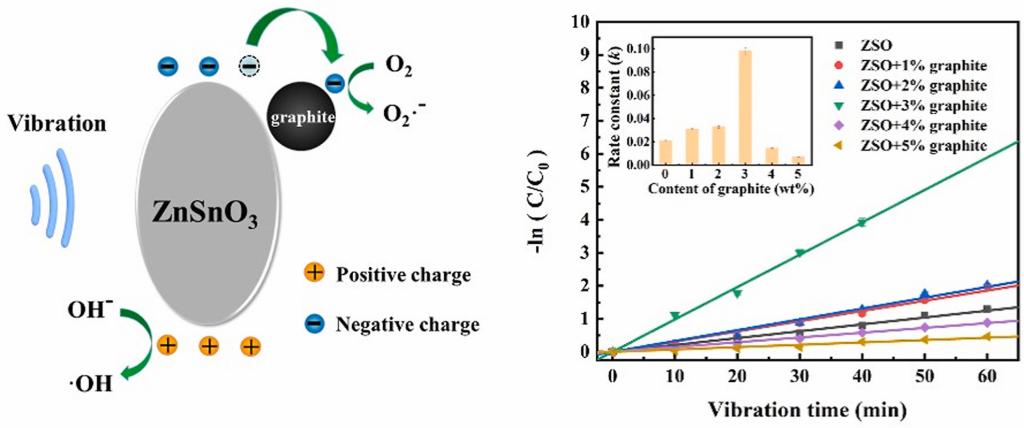 近日,公司武峥博士课题组在新型压催化降解染料废水方面再次取得新进展,相关成果发表在Ceramics International (49, 29614, 2023) (IF=5.2,中国科公司SCI一区)。题目为“Strongly enhanced piezoelectric-catalysis of ZnSnO3/graphite hybrid materials for dye wastewater decomposition”。武峥博士为第一作者,硕士生范保喜为第二作者。2026世界杯官方合作网站环化公司为第一单位。本工作中,通过溶胶凝胶法合成了压电锡酸锌纳米材料,并在其中混合一定比例的导电石墨,用于加速压电诱导的载流子的迁移,从而获得提高了的压催化性能。在混合石墨比例为3%时,压催化效果达到最优,对罗丹明B染料溶液的降解率达~100%,反应速率常数为~0.098 min-1,远高于纯锡酸锌催化剂对罗丹明B染料溶液的降解率~73%和反应速率常数~0.021 min-1。该压催化剂在纺织印染废水中处理中具有重要的应用前景。