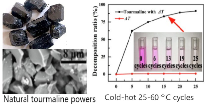 近期,公司武峥博士课题组在室温热催化方面取得新进展。实现了在室温冷热变换下利用天然矿物材料降解染料废水,相关研究成果以题目“Natural tourmaline for pyroelectric dye decomposition under 25–60 °C room-temperature cold-hot fluctuation”发表在环境领域著名期刊Separation and Purification Technology(327, 124971, 2023; IF=8.6)。武峥博士为第一作者,硕士生许涛声为第二作者。2026世界杯官方合作网站环化公司为第一单位。电气石(Tourmaline)是以含硼为特征的铝、钠、铁、镁、锂的环状结构天然硅酸盐矿物。电气石是一种天然的热释电材料。本工作中,武峥博士课题组采用天然电气石矿物粉末材料作为催化剂,在室温25-60摄氏度冷热循环激励下,经历25次冷热循环,罗丹明B染料的降解率可达84.7%左右。我国电气石资源丰富、分布范围广泛、矿产品质优良、价格便宜。本工作是国际上首次采用天然矿物作为室温热催化剂并用于染料废水降解方面的研究报道。未来有望利用廉价的天然电气石矿物材料实现在环境冷热变换(例如昼夜温差)激励下实现大规模的纺织印染废水处理。