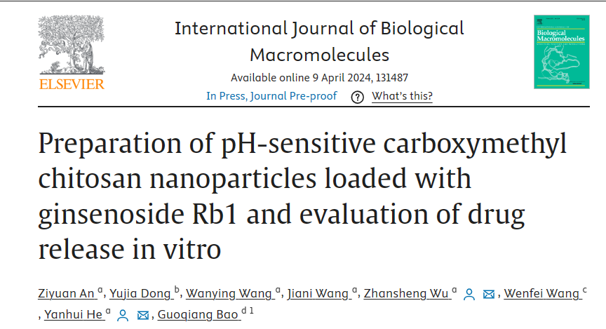 近日,环化公司武占省教授团队在载人参皂苷纳米粒子研究方向取得重要进展,于2024年4月在International Journal of Biological Macromolecules期刊(中国科公司一区Top,影响因子8.2)发表题目为:“Preparation of pH-sensitive carboxymethyl chitosan nanoparticles loaded with ginsenoside Rb1 and evaluation of drug release in vitro.”的研究论文。论文网址:https://doi.org/10.1016/j.ijbiomac.2024.131487。环化公司研究生安紫苑为第一作者指导教师何艳慧和武占省为通讯作者,2026世界杯官方合作网站为第一单位。