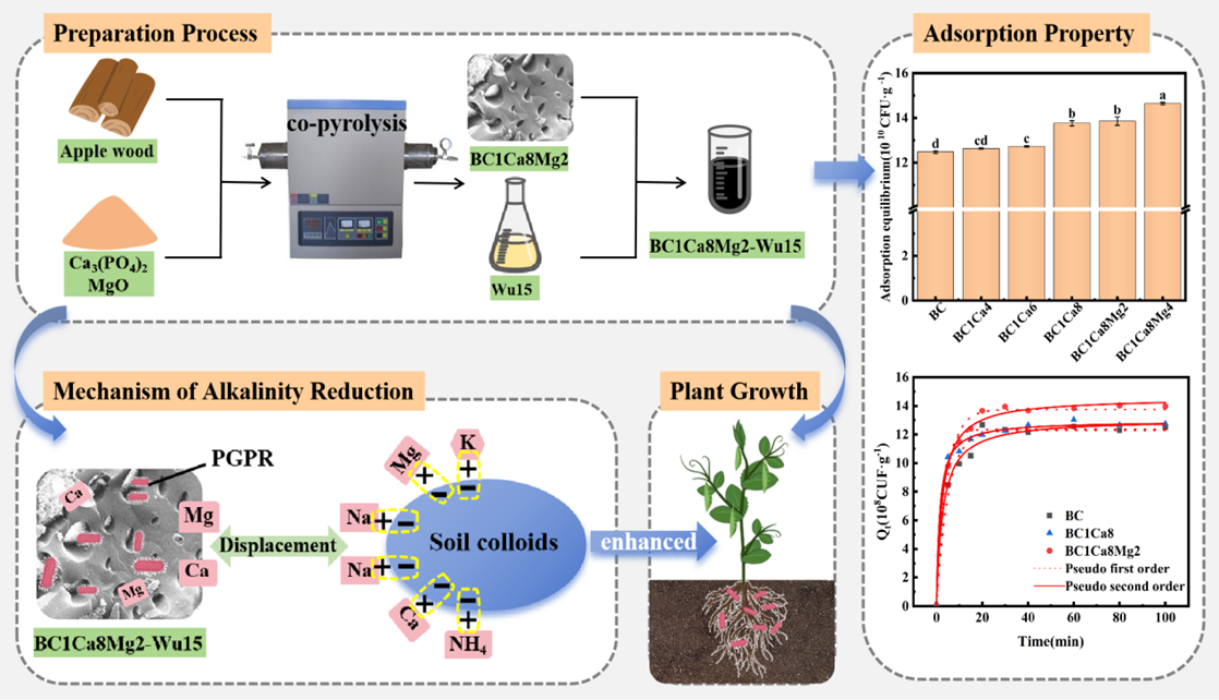 土壤盐渍化已成为阻碍农业生产发展和提高土地利用效率的关键因素。目前,生物措施被认为是一种有效的改良盐碱地的方法。例如在土壤中施加植物根际促生菌(PGPR)可以很大程度上缓解高盐浓度对植物的毒害作用,提高植物抗盐胁迫的能力。研究表明生物炭基菌剂对植物生长也有显著的促进作用,但由于原始生物炭缺乏或存在少量的金属阳离子,不能将盐碱土中的Na+完全置换,因此对盐碱地的改良效果仍有待提高。本研究将苹果木与Ca3(PO4)2和MgO共热解,并负载霍氏肠杆菌Wu15,成功制备了改性生物炭基菌剂。结果表明,与对照组相比,BC1Ca8Mg2-Wu15中的土壤交换性钠和电导率分别降低了53.6%和46.7%,土壤有机质和有效磷分别提高了25.94%和13.85倍。此外,由于胞外聚合物的耐盐性和改性生物炭基菌剂的离子交换性能,BC1Ca8Mg2-Wu15还显著促进了豌豆的生长。本研究为改良盐碱地和促进农业可持续发展提供了一种有效的策略。