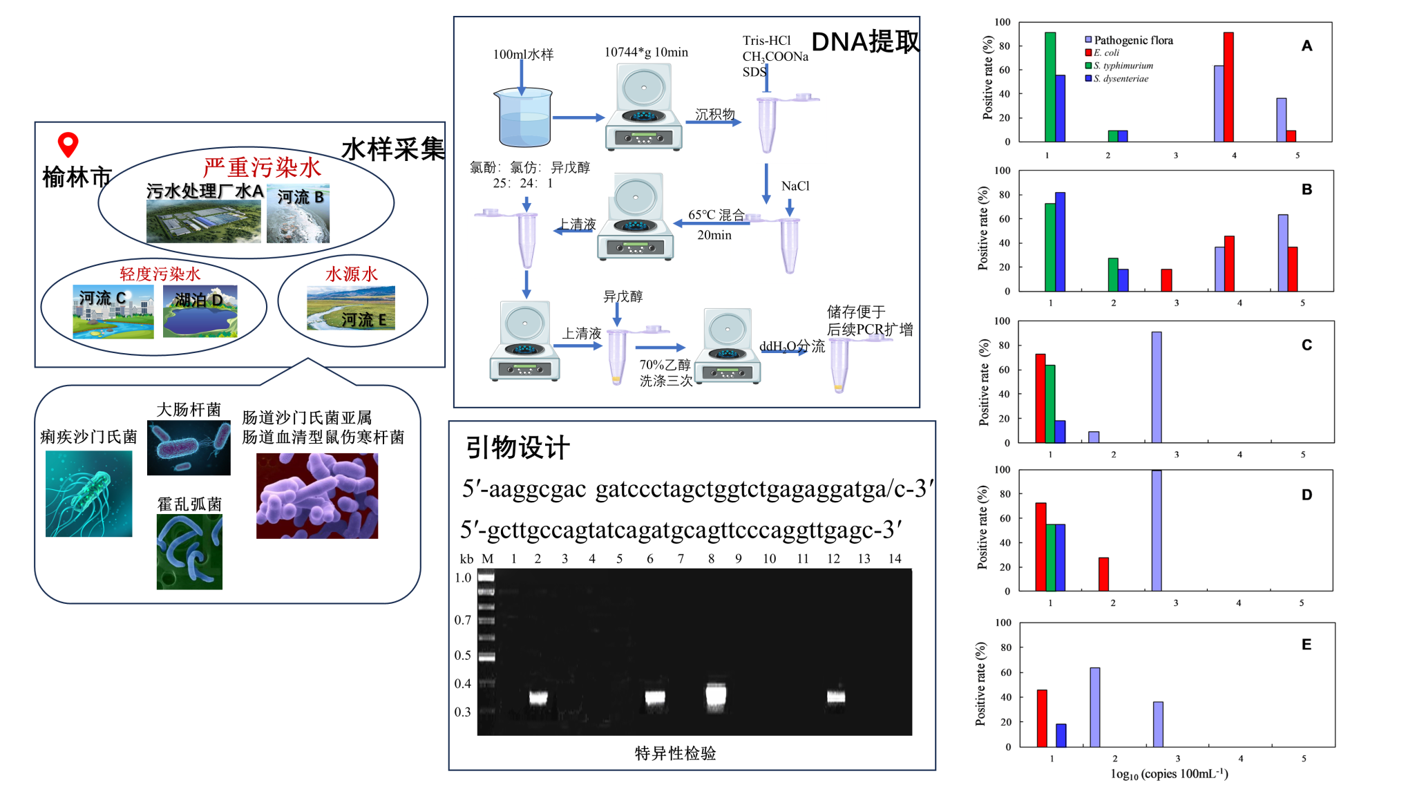 本研究建立了一种准确、快速的定量PCR(qPCR)方法,可同时检测水中4种病原菌(大肠杆菌、痢疾沙门氏菌、肠道沙门氏菌亚属肠道血清型鼠伤寒杆菌、霍乱弧菌),并检测出不同污染程度地表水中病原菌的分布情况(中国榆林地区)。结果表明,该引物具有特异性,能够准确的检测出水中四种病原菌,检测准确率为94%;病原菌细胞的检测限为2.7。当通用引物检测病原菌丰度大于104copy·100 ml-1时肠道沙门氏菌亚属肠道血清型鼠伤寒杆和痢疾沙门氏菌始终存在于水中。当检出值低于104copy·100 ml-1时,水中几乎没有致病菌,因此104copy·100 ml-1可作为水中病原菌传播污染的新指标。