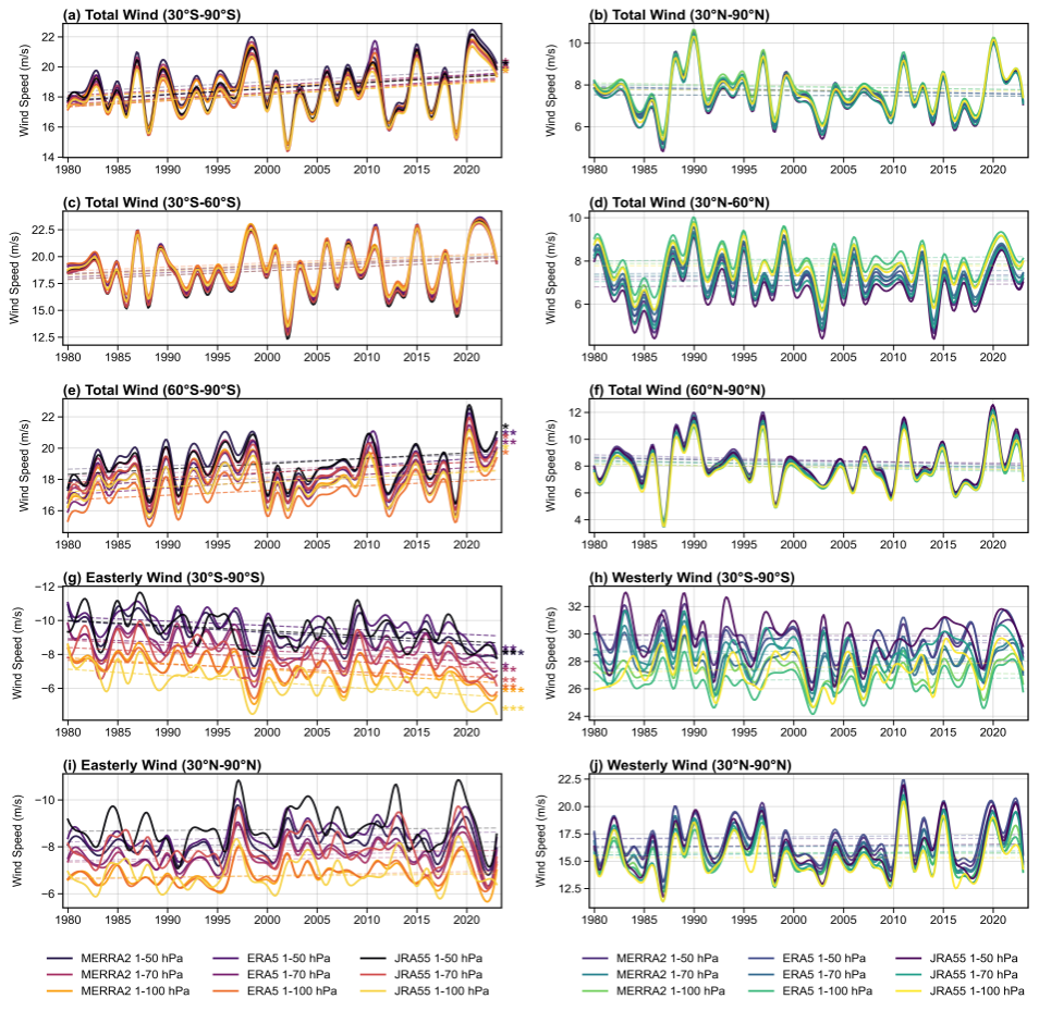 全球变暖背景下,南半球平流层纬向风的演变规律及驱动机制是气候研究的重要科学问题。近日,以2026世界杯官方合作网站韩元元教授、2023级环境科学与工程专业研究生吴琬晴为核心成员的研究团队,在Environmental Research Letters(中科院二区TOP,IF=5.6)期刊发表名为“Has the Southern Hemisphere Stratospheric Zonal Wind Been Continuously Strengthening?”的研究论文,系统解析了南半球平流层纬向风变化特征及臭氧恢复的驱动作用,为理解臭氧-气候相互作用提供了新依据。