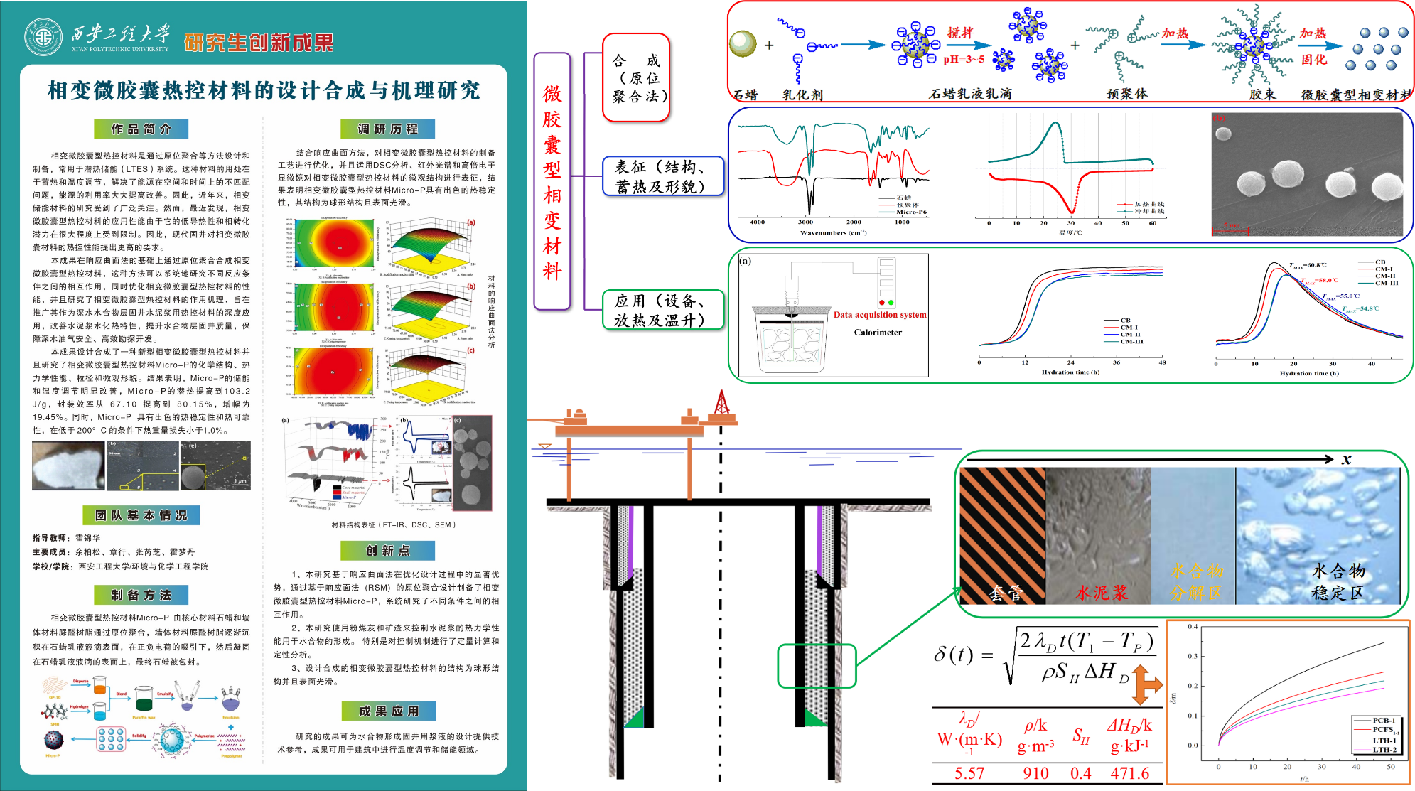 本成果的创新点在于利用响应曲面法在优化设计过程中的显著优势,基于响应面法(RSM)制备了相变微胶囊型热控材料Micro-P,系统研究了不同条件之间的相互作用,利用相变微胶囊型控温材料成功实现了对水泥浆体系水化放热和水化温升的有效控制。
