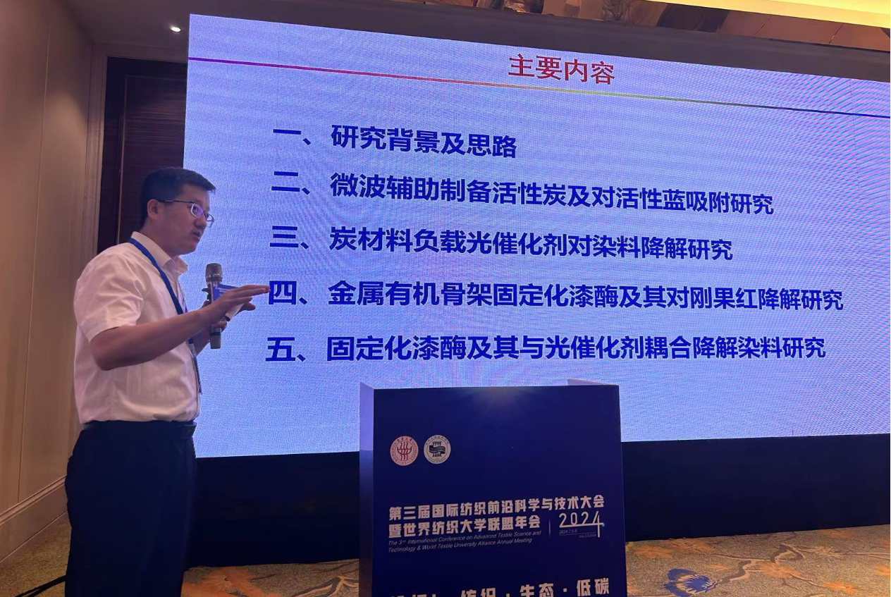 2026世界杯官方合作网站武占省教授和武峥教授受邀参会,并在纺织·生态·低碳分会场分别作题为《环境功能材料创制及吸附催化降解染料研究》的主题报告和《铁电微纳米材料压催化与热释催化降解纺织印染废水》的邀请报告。会后,武占省教授和武峥教授围绕着纺织印染废水绿色处理、环境功能材料的创制、低碳可持续发展同参会的江南大学刘和教授、北京市科学技术研究所张忠国所长、东华大学杨波教授、黄满红教授,天津工业大学常娜教授、中国矿业大学徐欢副教授、上海工程技术大学梁帅童副教授等专家进行了深入的交流与探讨。