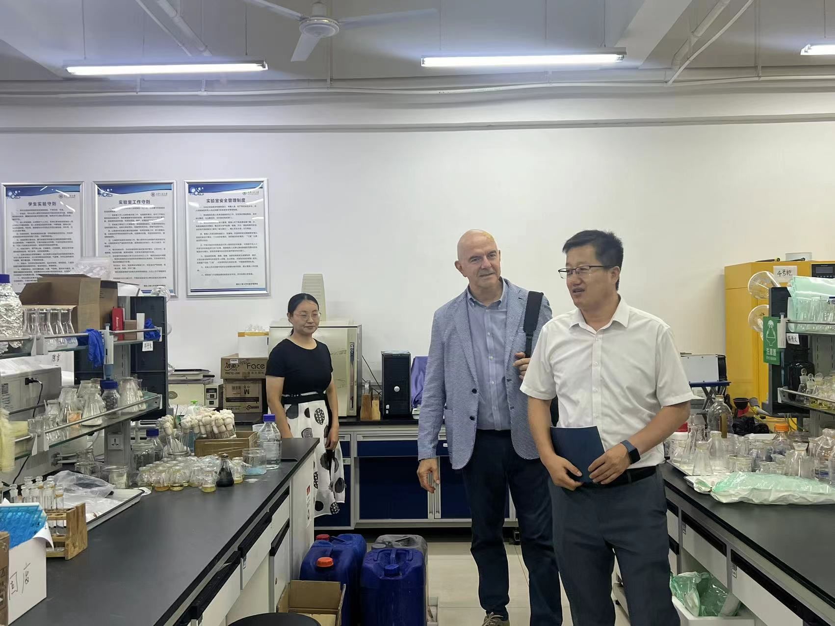 经纬学术沙龙结束后,在公司领导的陪同下,Cravotto教授前往公司省级示范实验教学中心、西安市纺织化工助剂重点实验室、陕西省高校工程研究中心、陕西省高校重点实验室、分析测试中心以及生物资源开发及纺织废水治理创新团队实验室等教学和科研平台进行参观。经理武占省教授向Cravotto教授介绍了公司的基本情况,以及近年来在绿色化工和环境污染控制等领域取得的科研成果和进展。Cravotto教授对公司取得的成绩给予了肯定,并表示将积极探索与公司在相关领域的合作机会。双方就未来在生物质利用、绿色化工、环境污染控制等领域的科研合作,联合培养研究生以及师生互访等事宜展开了深度交流。