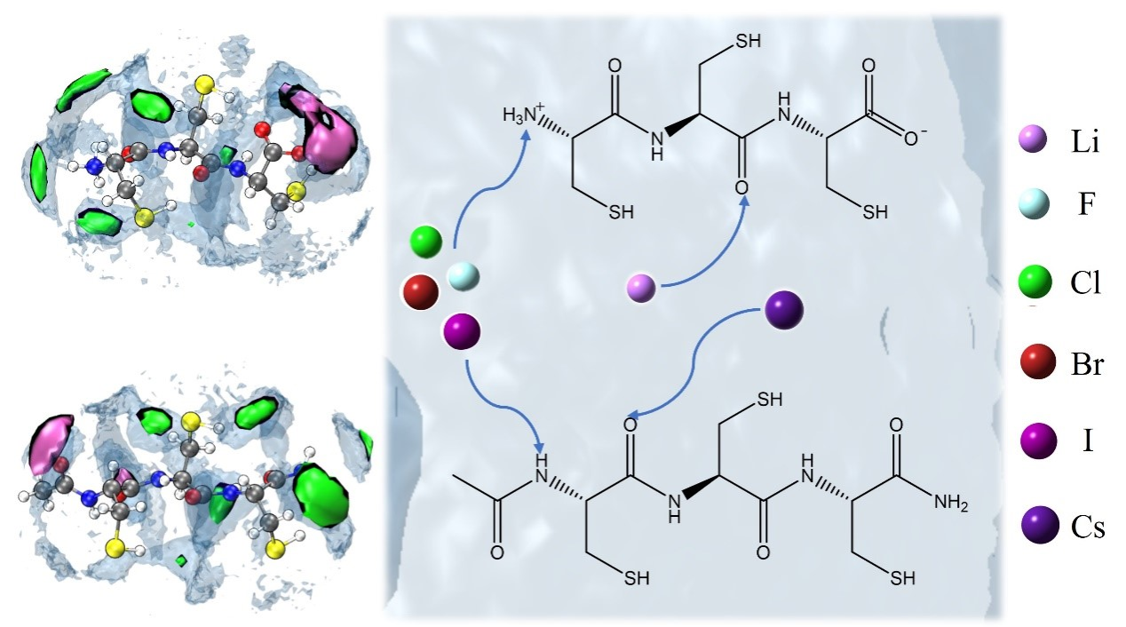半胱氨酸是组成蛋白质的一种重要的带有巯基的氨基酸,这一特性使得它在生物过程中扮演着关键的角色。研究半胱氨酸与离子的相互作用有助于深入理解蛋白质的结构和功能,以及它们在生物体内的调控机制。以往的研究往往只考孤立的虑阴离子或阳离子的尺寸或种类的变化对半胱氨酸结构与性质的影响。然而,在实际的生物体系中,阴离子和阳离子共存,需要考虑阴阳离子的协同作用。在陕西省科技厅,教育部春晖项目的支持下,环化公司李仁忠教授研究组取得了一系列进展(Chem.Phys.Lett.2024, 850.141454;ACS Omega2022, 7, 18646-18659)。