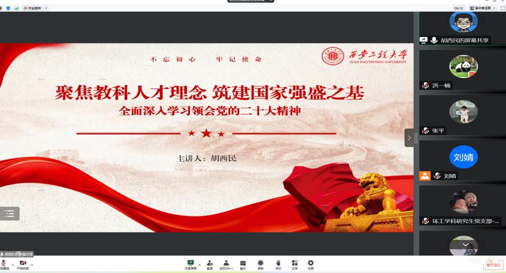 会上,公司党委书记胡西民作《聚焦教科人才理念,筑建国家强盛之基——全面深入学习领会党的二十大精神》的报告。胡西民首先回顾了大会的基本情况和大会报告的主要内容,从深刻把握党的二十大的重要意义,深刻把握“三个全面”,深刻把握“五个重大原则”,深刻把握“五个牢记”等方面对二十大报告进行了全面深入的解读,并对二十大报告中关于教育、科技、人才工作的战略部署进行了系统阐释。他表示公司是培养人才的地方,是科学创新的基地,全院师生应时刻牢记教育、科技、人才是国家发展的战略之基。我们当下的责任担当一方面是防疫抗疫,而更主要的是学习科学文化知识,提高科技创新能力。我们要珍惜宝贵的时间,争取在校期间多读一篇科研论文,多做一次创新实验,上好每一节课,做好每一次作业。他号召全体党员把学习贯彻落实党的二十大精神作为当前和今后一个时期首要政治任务,并把学习成效转化为推动公司高质量发展、个人全面提升的强大动力。