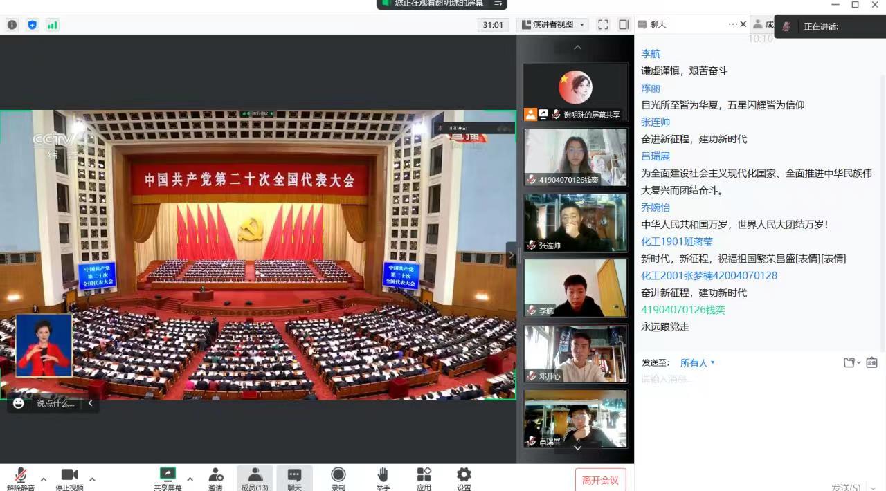 化工系党支部书记杜燕萍表示:党的二十大是在迈上全面建设社会主义现代化国家新征程这一关键时刻召开的大会。习书记强调要永葆“赶考”的清醒和坚定,以咬定青山不放松的执着奋力实现既定目标,团结就是力量,奋斗开创未来。我们作为高校教师,要始终坚持思想筑基,赓续师道传统,在细微处见师德,在日常中守师德,将师德规范转化为内在信念和行为品质。坚守初心使命,激励担当作为,用奋斗挥洒出时代的华彩,推动公司、公司事业高质量发展。