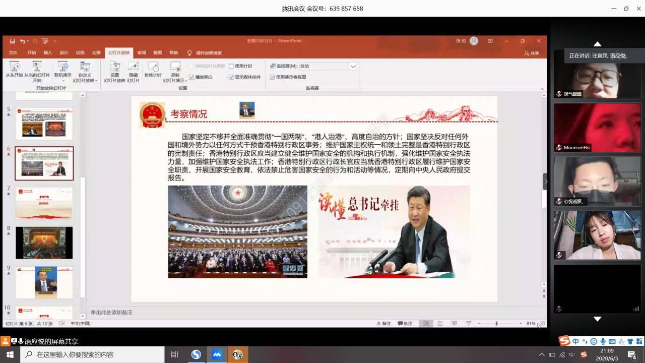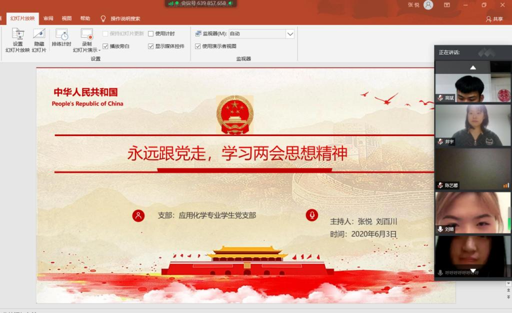 2020年6月3日,环化公司应用化学专业员工党支部召开“学两会精神,永远跟党走”学习讨论会,会议采用网络会议的形式,支部宣传委员刘百川与党员张悦共同主持,支部29名党员参加。
