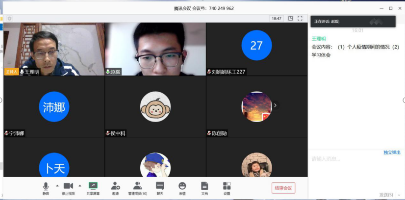 最后,王理明对此次会议做了总结,他希望大家通过学习,把榜样的力量转化为前进的动力,积极发挥党员的先锋带头模范作用。作为在这个特殊时期的亲历者,要学会思考,将社团的工作与当下防控工作结合,做出协会应有的贡献,以自己的实际行动传承弘扬榜样精神,在担当中主动作为,在实践中埋头苦干,用青春之音谱写青年一代最美的华章。(撰稿:王理明审稿:李建学)