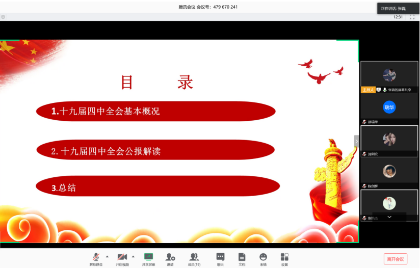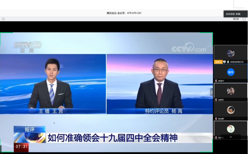 支部书记邵瑞华领学了十九届四中全会通过的《中共中央关于坚持和完善中国特色社会主义制度、推进国家治理体系和治理能力现代化若干重大问题的决定》这一完善和发展我国国家制度和治理体系的纲领性文件。通过专家解读弄懂了坚持和完善中国特色社会主义制度、推进国家治理体系和治理能力现代化的总体目标;我国国家制度和国家治理体系十三方面的“显著优势”;十三个“坚持和完善”具体内容。