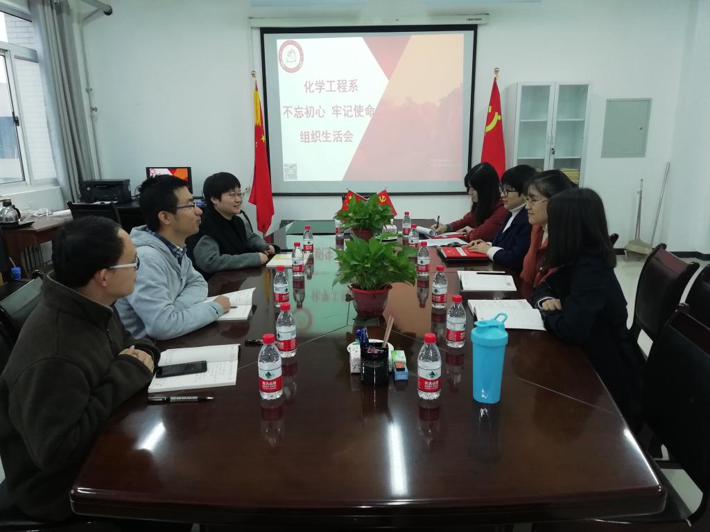2019年10月24日上午,环化公司化工系党支部在环化公司506会议室召开了“不忘初心、牢记使命”主题生活会。支部书记杜燕萍同志根据党中央的要求,向青年教师党员们强调了立德树人的重要性,督促大家进一步学习习近平关于对高校教师的党建要求。并进一步深入讨论了“双创”支部的建设要求,对照职责进行了详细分工,党员们表示会以饱满的热情积极参与“双创”支部的建设。