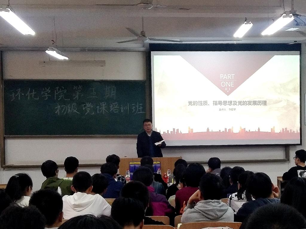 李建学老师主讲了第一课——党的性质、任务、指导思想,他从“党是以科学理论武装起来的”、“党是由工人阶级的先进分子所组成”、“党制定了正确的奋斗目标”、“党是按照民主集中制原则建立起来的”、“党是在不断革新,不断自我修正中成长壮大的”、“党的领导地位是长期革命和建设中形成的”、“党的领导是中国特色社会主义事业取得胜利的根本保证”等七个方面对这一问题做了阐述,要求同学们对照党章思考自己如何在学习生活中发挥先锋模范作用。