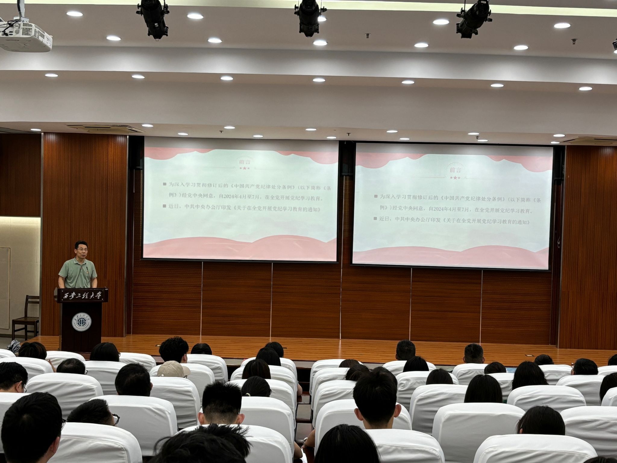 为进一步强化党员纪律意识,提升党性修养。6月13日,公司于图书馆二楼报告厅举办党纪学习教育专题党课。公司党委书记胡西民以“扎实开展党纪学习教育,以严的基调全面加强纪律建设”为主题为全体师生党员进行现场授课。