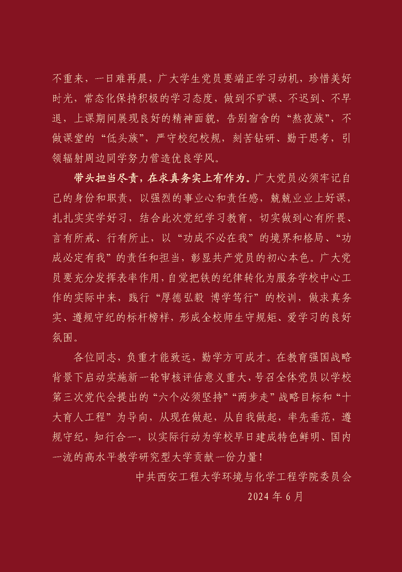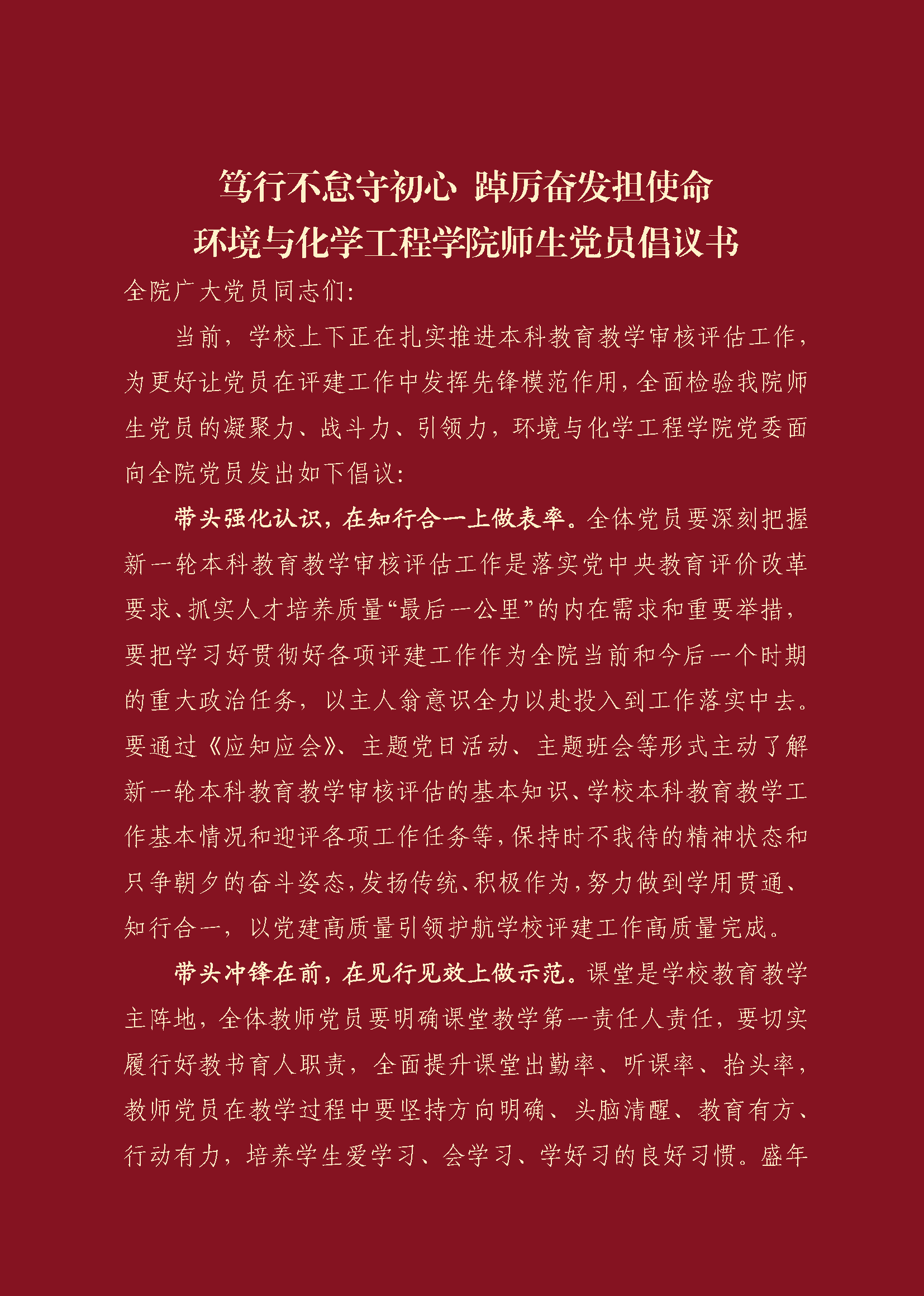 《倡议书》从“带头强化认识,在知行合一上做表率”“带头冲锋在前,在见行见效上做示范”“带头担当尽责,在求真务实上有作为”三方面对公司教师和员工发出倡议,围绕审核评估工作过程中,师生党员“做什么”“怎么做”“做成什么样”等问题提出要求。《倡议书》中提到,全体党员要把学习好贯彻好各项评建工作作为全院当前和今后一个时期的重大政治任务,以主人翁意识全力以赴投入到工作落实中去。广大教师要切实履行好教书育人职责,坚持方向明确、头脑清醒、教育有方、行动有力,培养员工爱学习、会学习、学好习的良好习惯。广老员工党员要端正学习动机,珍惜美好时光,展现良好的精神面貌,引领辐射周边同学努力营造优良学风。《倡议书》还要求广大党员要自觉把铁的纪律转化为服务公司中心工作的实际中来,践行“厚德弘毅 博学笃行”的校训,做求真务实、遵规守纪的标杆榜样,形成全校师生守规矩、爱学习的良好氛围。