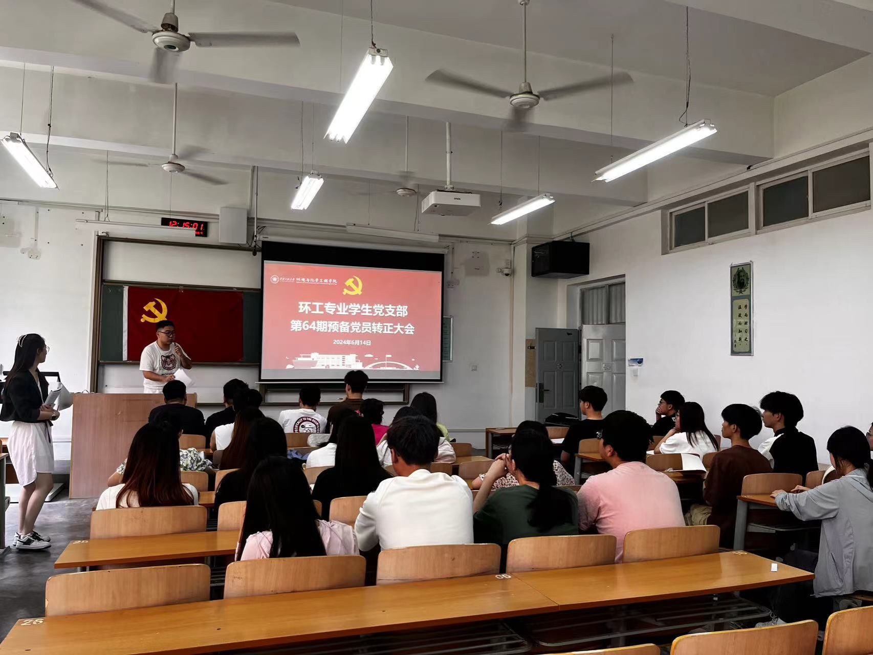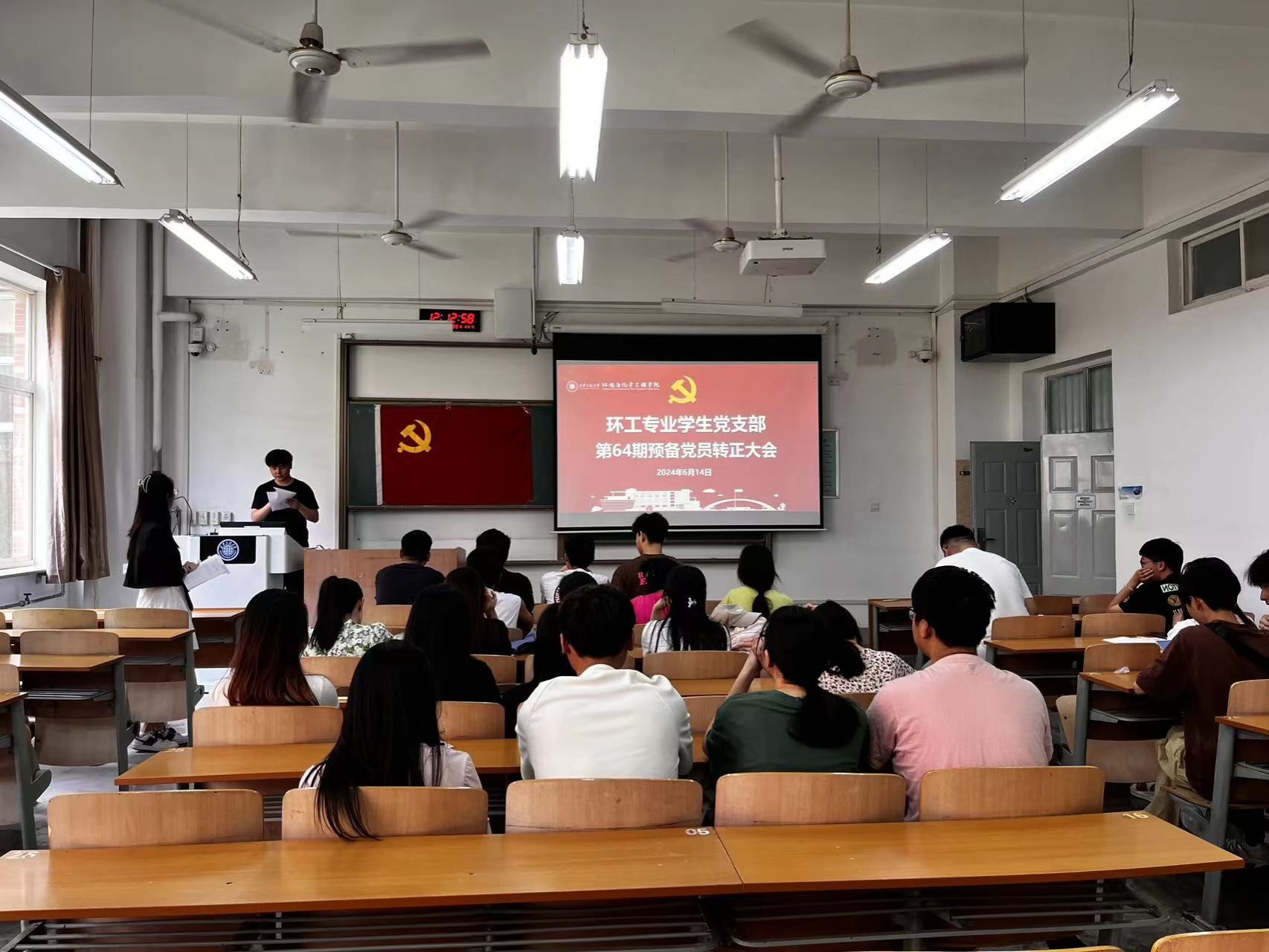 环工专业员工党支部于6月14日在A座教学楼112教室召开第64期预备党员转正大会,会议内容主要是接收屈嘉鑫等8名同志的转正事宜。会议由支部书记任子瑜主持,支部全体党员参加会议。