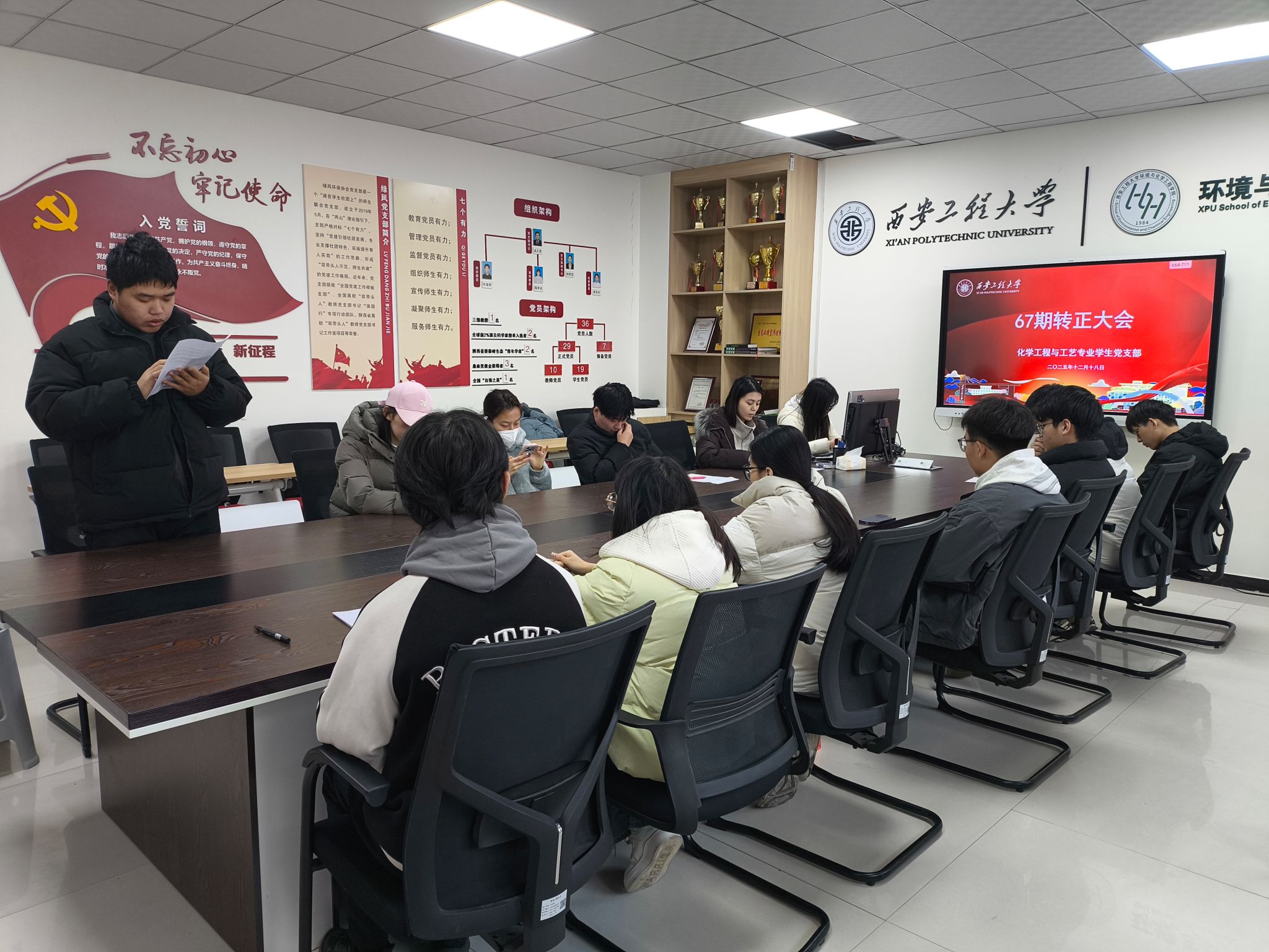 会上,盖潇宇介绍了本次转正对象和发展对象的基本情况,并对会议流程与表决方式作了说明。随后,一名发展对象宣读入党志愿书,三名预备党员依次宣读转正申请。入党介绍人分别就相关同志在培养考察期间的思想、学习、实践和群众表现等方面进行了介绍。经与会党员充分讨论及无记名投票,大会一致同意接收左高强同志为中共预备党员,批准张赟等三名同志按期转为正式党员。