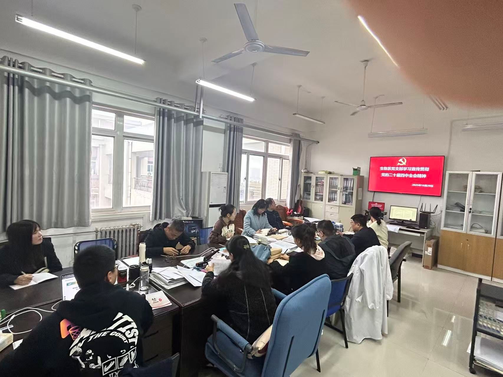 生物系党支部在生物工程专业教研室召开专题学习会,组织全体党员深入学习党的二十届四中全会精神与习近平总书记给全国特岗教师代表的重要回信精神。支部全体党员、部分教师代表以及员工党员骨干参加了学习,会议由党支部书记潘虹主持。
