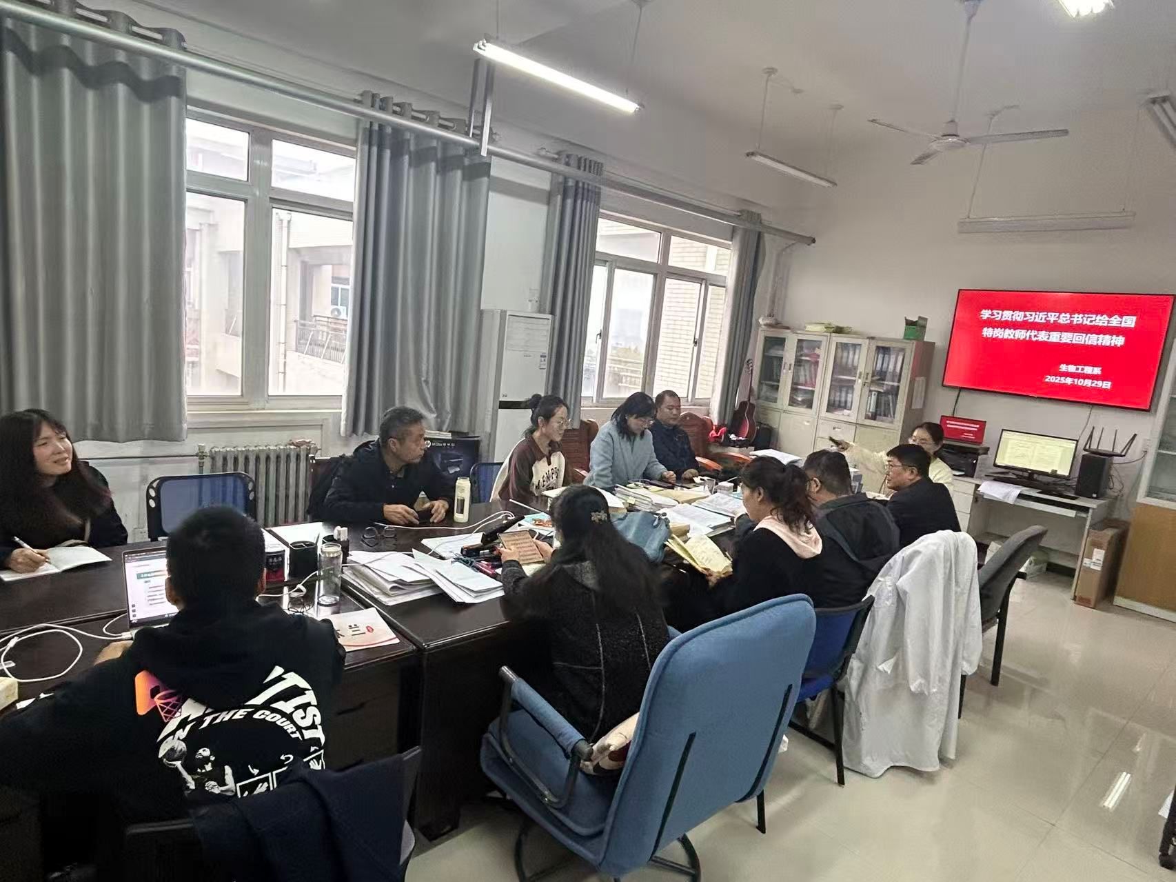 在随后的交流研讨环节,与会党员结合自身教学科研实际,畅谈学习体会,分享心得感悟。青年教师党员曹翠表示,作为生物学科的科研工作者,必须将个人研究融入国家发展大局,围绕国家在生命健康、粮食安全、生态保护等领域的重大需求开展创新研究。教学一线党员孙先锋副教授深有感触:“总书记在回信中勉励教师要自觉践行‘学为人师、行为世范’,这让我更加坚定了做好课程思政的决心。”生物工程教研室主任王晓军老师结合近期正在修订的2025版人才培养方案,谈了自己的思考。她认为必须将全会精神和回信精神融入公司产品全过程,优化课程体系,培养符合新质生产力发展需求的生物领域创新人才。同时要组织力量围绕生物医药、绿色生物制造、合成生物学等前沿领域开展有组织的科研攻关,力争产出服务国家战略需求的原创性成果。