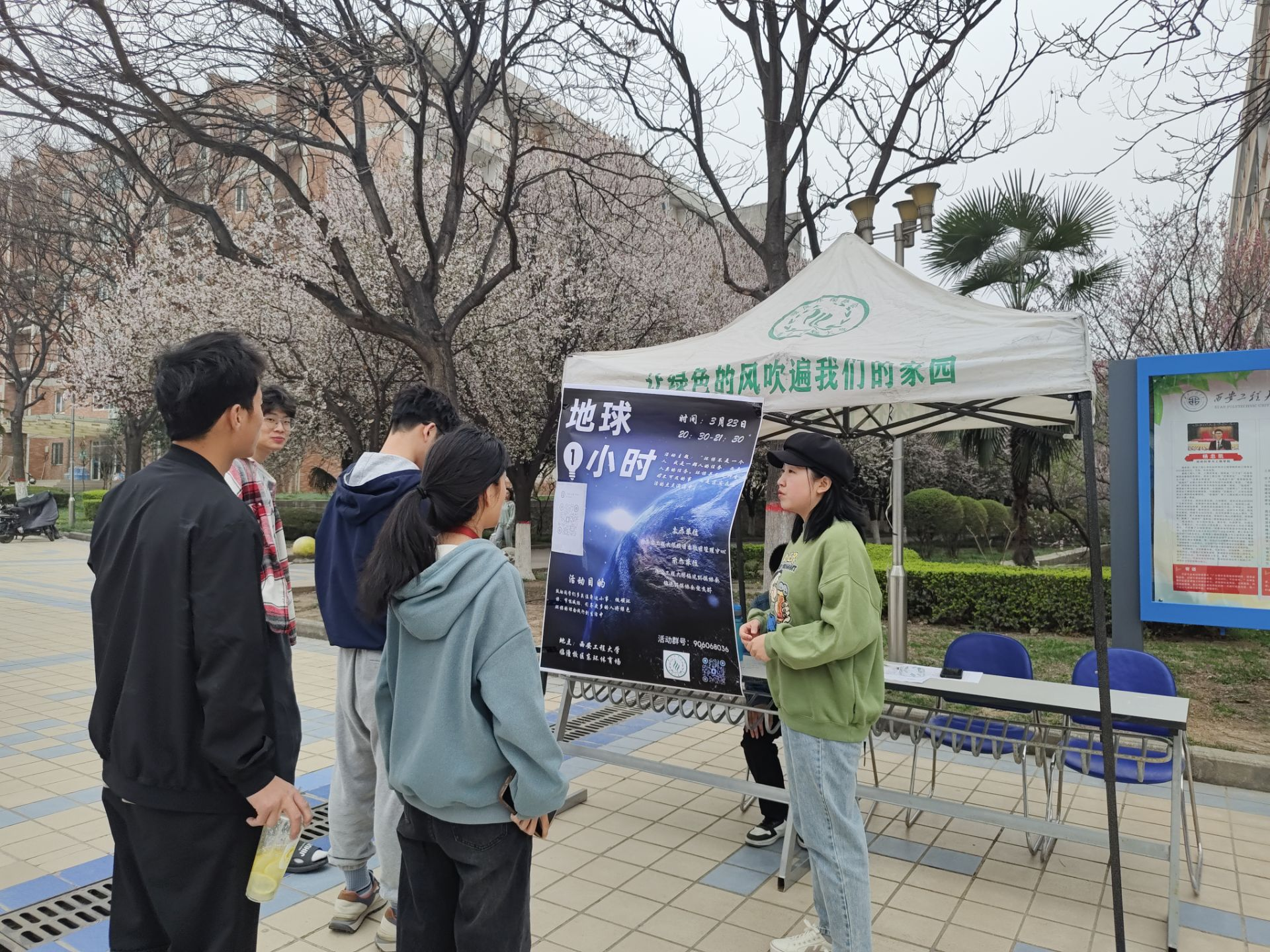 活动当天,绿风环保协会在临潼校区中心广场和员工宿舍向大家介绍“地球一小时”活动,倡导同学们养成节能习惯,增强对保护地球的责任感,呼吁大家在晚上8:30-9:3积极参与到“熄灯一小时”的活动中来。为配合活动的顺利开展,增强趣味性,他们还承办了“以旧换新、绿色集市”、“荧光夜跑”等活动,积极引导同学们走下宿舍、走向操场,以积极健康的心态来创造自己美好的校园生活。
