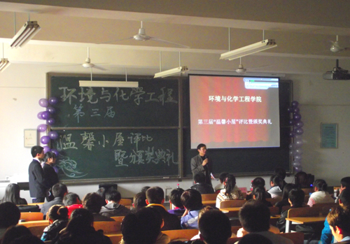 11月18日下午4时,环化公司第三届“温馨小屋”暨颁奖典礼在临潼校区教学楼D-3110举行。下午3时50分,员工工作办公室副主任、团总支书记王晓先老师以及员工会常委作为评委在11级同学的掌声中入场就坐。