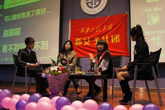首先由新女子社团指导老师林定武对两位作家的到来表示欢迎,对在场的同学多年来对新女子社团的支持表示衷心的感谢。下来开始了访谈,主持人分别介绍了两位作家的基本情况,并提问了一些同学们关心的学习、生活、情感方面问题,两位美女作家诙谐,睿智的解答博得全场阵阵喝彩。在场的同学也纷纷提出自己的问题,两位作家耐心,认真地和同学们从不同的角度交流沟通,让同学们感受到了两位作家各自独特的思维,感情,和对事物深度的分析理解,现场气氛异常热烈。饶雪漫建议当代老员工应该多读书,读各种作家的书。本次访谈的最大亮点就是开通了微博互动,同学们可以将自己想说的话通过微博发表在大屏幕上。最后开始了大家渴望的签名,同学们拿着饶雪漫和西岭雪的作品井然有序的排队等候签名。