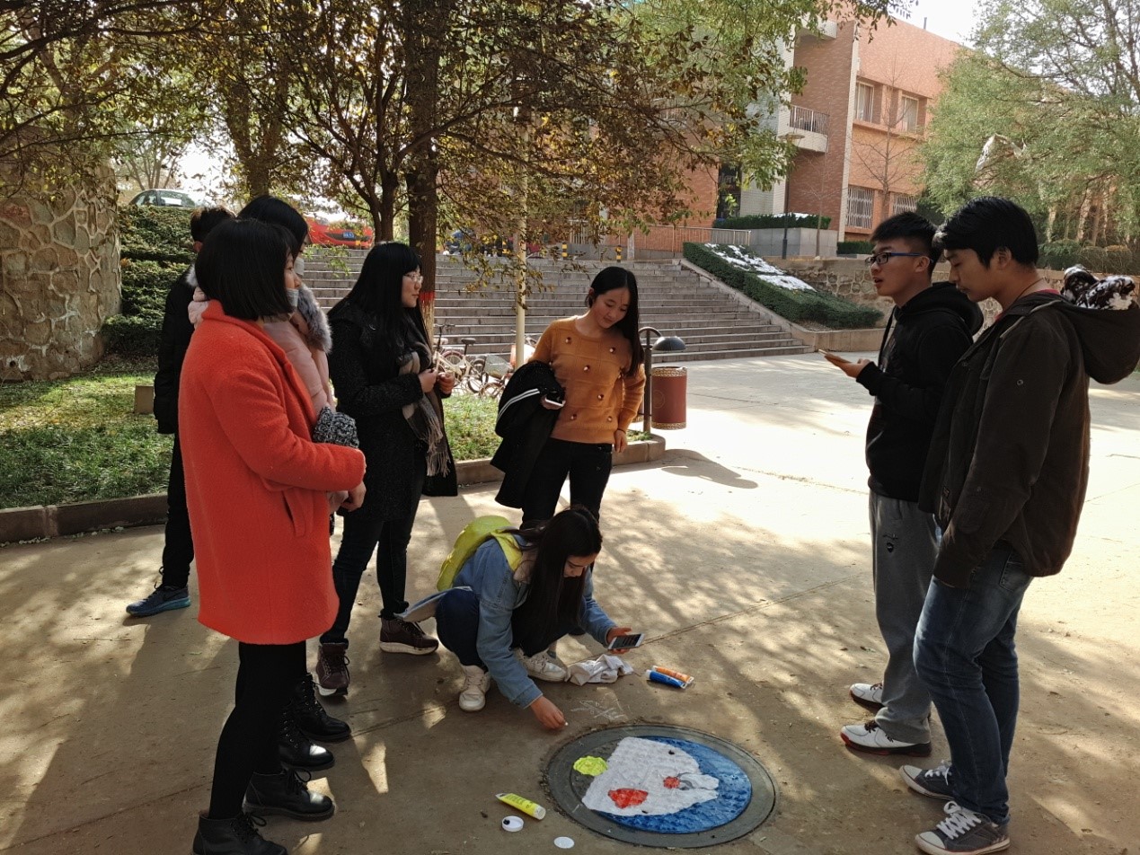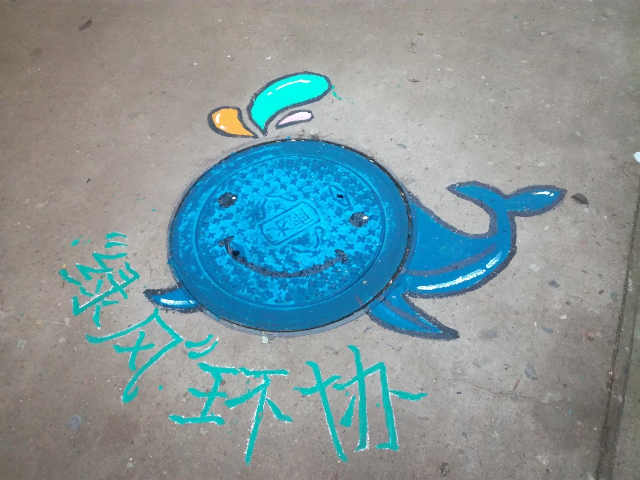 井盖是同学们生活的地方和下水道之间的屏障,环保从小事做起,排污从点滴做起,这次美化行动,给这个寒冬增添了暖意。不过也希望同学们珍惜他们的劳动成果,不要践踏。
