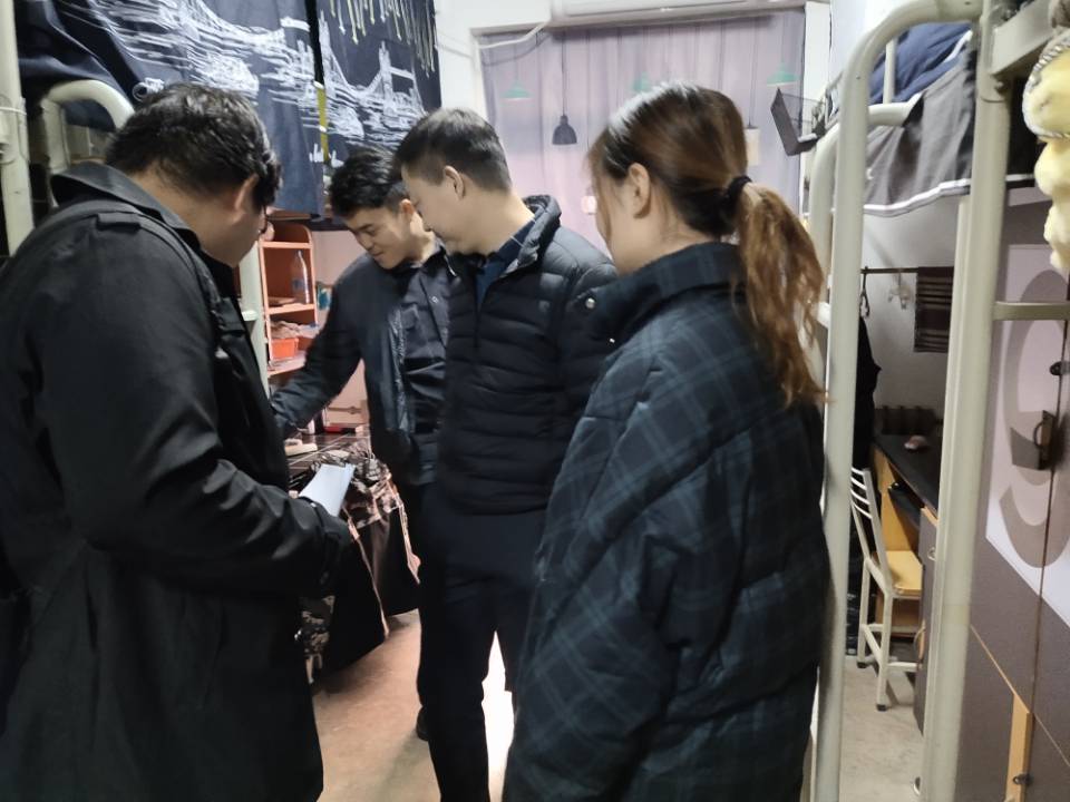 赖斌首先对本次评比的工作人员提出了要求,着重强调了活动的公正公开性,并对冬季员工宿舍的安全隐患及检查重点做了部署。在随后的检查过程中,赖斌鼓励同学们要团结互助、共同进步,营造良好的宿舍环境,以舍风促学风。辅导员和员工会工作人员仔细检查每一间宿舍,并特别强调了宿舍管理相关规定。经过评比,最终5#B602宿舍获得一等奖,3#B413、3#B603宿舍获得二等奖,5#A201、6#B207、9#A301宿舍获得三等奖。