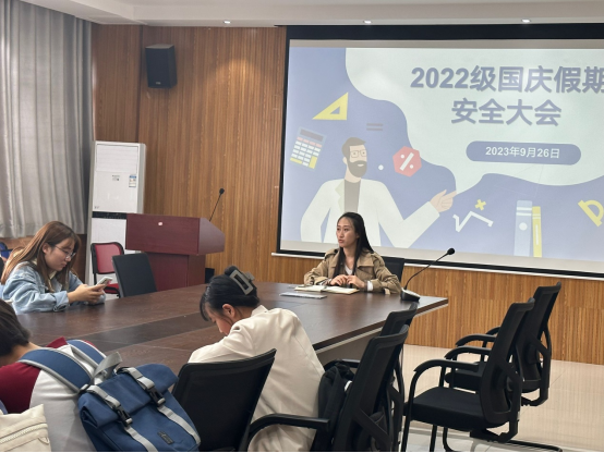 学校高度关注国庆节期间的安全问题,了确保广大师生的人身财产安全,2023年9月26日,公司在临潼校区8-507会议室召开国庆节假期安全大会,会议由2022级辅导员任子瑜开展,同时召集各班的班长团支书参加本次会议。