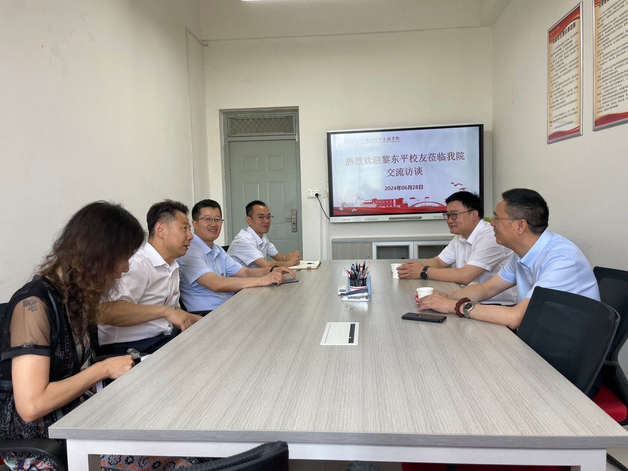6月28日,公司邀请来校参加毕业典礼的86级纺化系员工黎东平来公司开展交流座谈,校正处级纪检员李建学、国内合作暨员工工作处处长郭可义、环化公司党委书记胡西民、副经理(主持工作)武占省、副经理常薇、副书记林定武、经理助理武峥、环工系教授宗刚老师参加了会议。