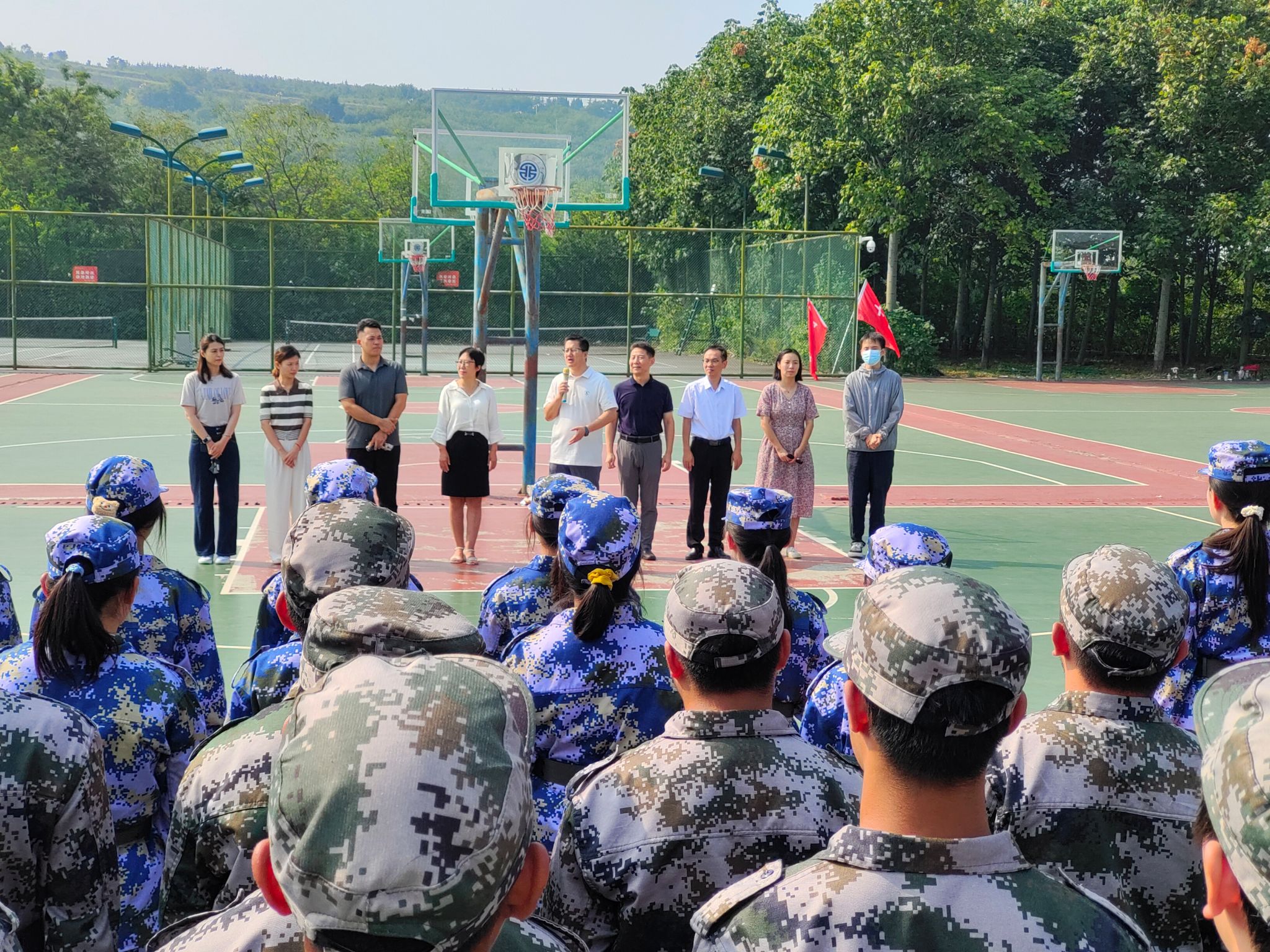 随后,公司老师共同为参训同学送上公司精心准备的慰问品,并叮嘱同学们近期天气高温炎热,要做好降温防暑保护措施,若感到身体不适,要及时向教官和辅导员老师反馈。