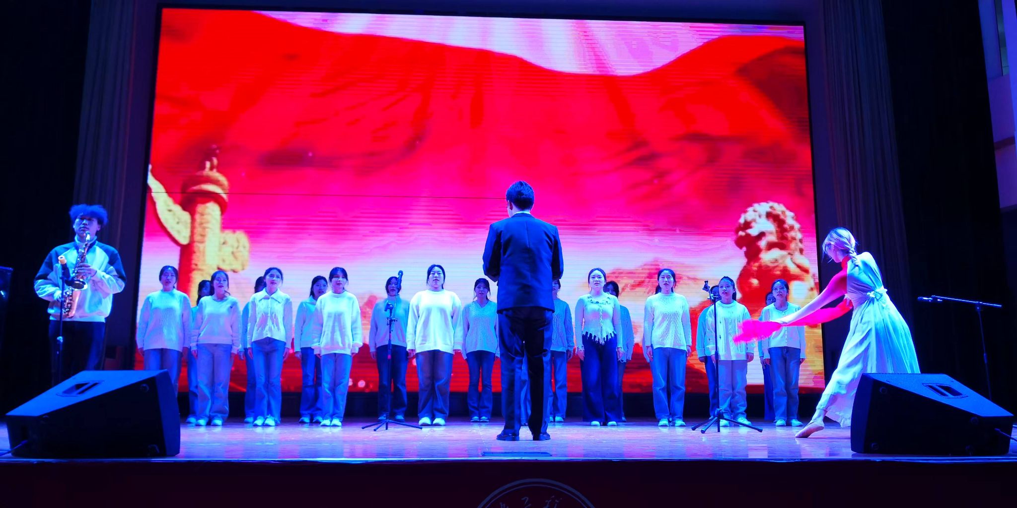 表彰结束后,迎新晚会在老员工艺术团带来的舞蹈《PLAY》中拉开帷幕,瞬间点燃了现场的气氛。晚会节目丰富多彩,公司绿风环保协会持续关注社区环保问题,上演情景相声《环保大作战》,译心心理社聚焦老员工拖延症问题,演绎话剧《老员工版谁杀死了周日》,先进班集体带着对祖国的赤诚热爱和融入血脉的家国情怀奉献了精彩的朗诵《山河如愿》,反映时代特色的歌曲演唱和展现中国传统文化的古典舞蹈相继登场,笑声与掌声交织成最美的旋律,全体辅导员带着改编的歌曲《浮躁》和《我也想出去玩》以老师视角讲述了他们从迷茫到坚定,从融入到热爱的心路历程,引起了在场师生的强烈共鸣,将晚会气氛推向高潮。晚会在激昂的校歌声中结束,与会嘉宾与全体演职人员共同上台,新老学子携手并进,记录下难忘的美好瞬间。