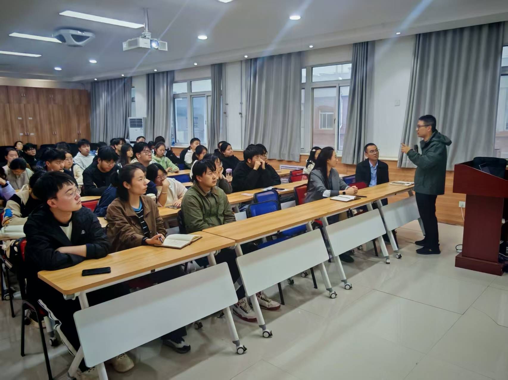 讲座尾声,公司党委副书记林定武作总结发言。他引用了“仰望星空,脚踏实地”的箴言,勉励同学们既要怀揣远大理想,更要立足自身实际情况,客观评估个人能力,选择最适合自己的院校。他特别强调,考研复习“在精不在多”,关键在于吃透核心知识点,构建完整的知识体系,实现高效备考。