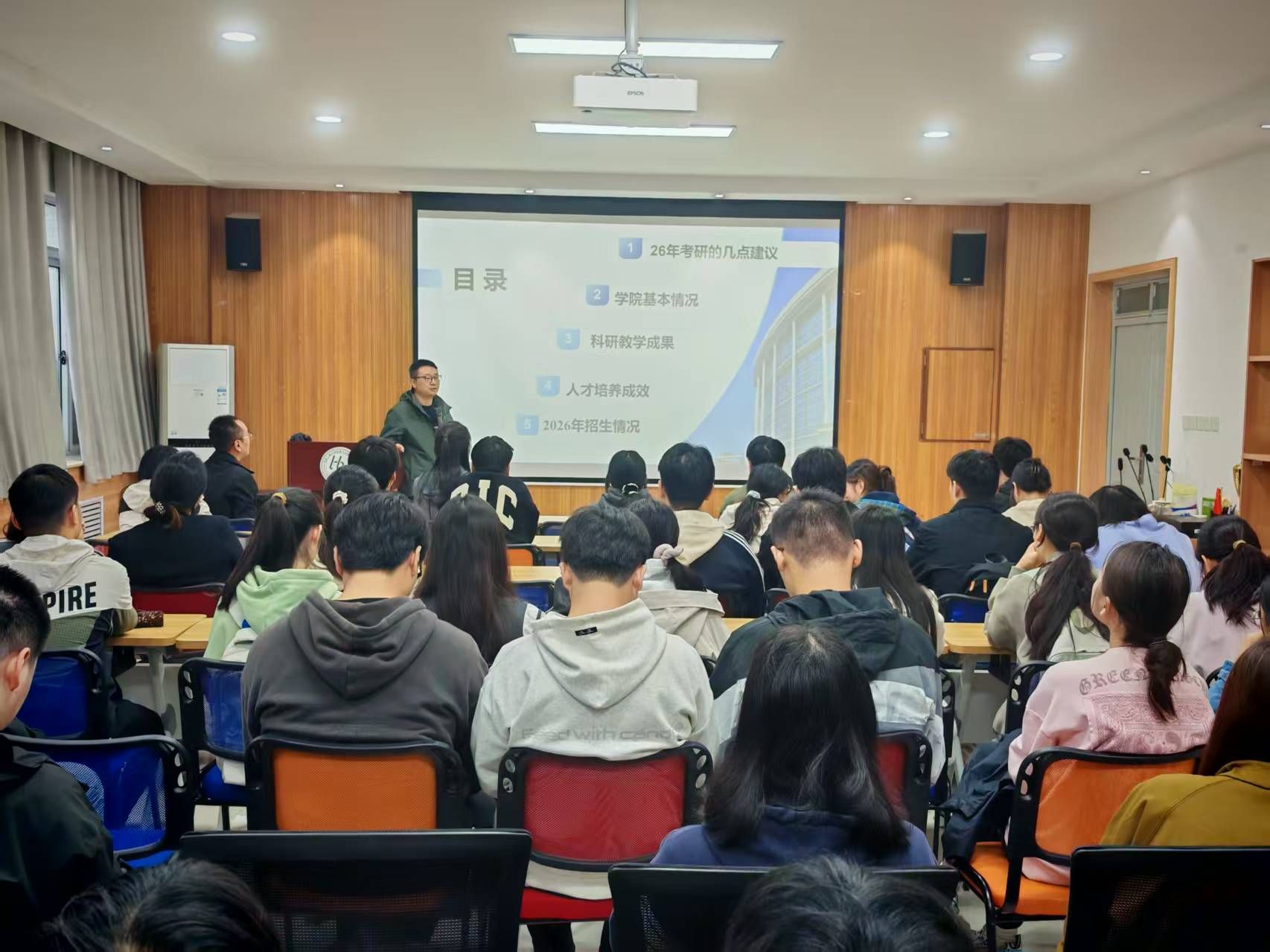 随后,刘斌系统梳理了学术型硕士与专业型硕士在考试科目、报考情况、面试调剂、培养目标、毕业要求等方面区别,为同学们提供了清晰的择类指南。在备考策略方面,他提醒大家要“避免冲刺式学习”,摒弃“虚假努力”的自我感动,强调持之以恒和高效学习方法的重要性,并详细指出了备考过程中的关键时间节点,帮助同学们合理规划复习进度。最后,他介绍了公司的学科特色、团队力量及研究生招生政策进行了宣讲,鼓励符合条件的同学积极报考本校。