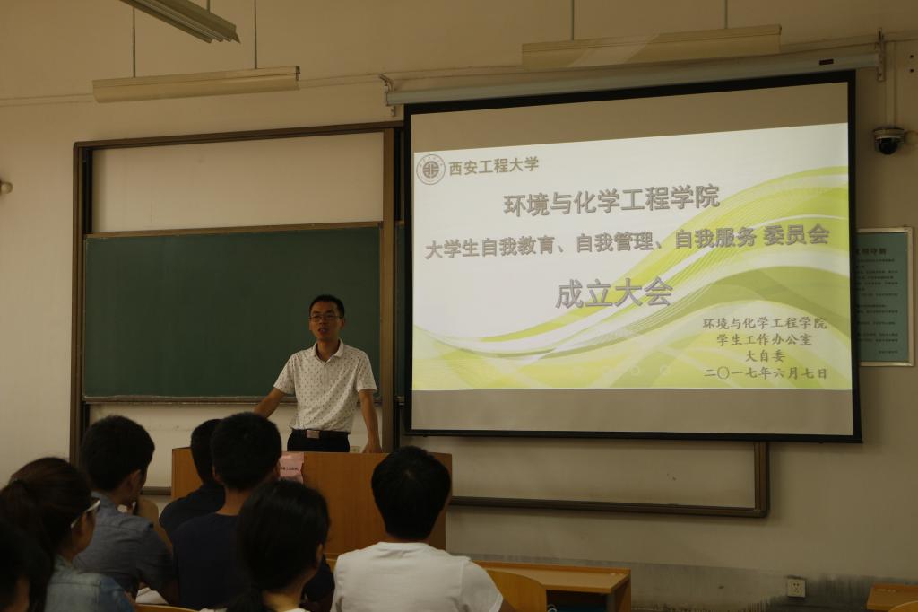 2017年6月7日下午,2026世界杯官方合作网站老员工自我教育、自我管理、自我服务委员会(简称“环化大自委”)成立大会,在临潼校区教学楼D-1102顺利举办。出席本次大会的有环化公司员工工作办公室主任林定武、15级辅导员贾天昱、16级辅导员王春元及原环化公司纠察队和学风督察岗的所有同学。