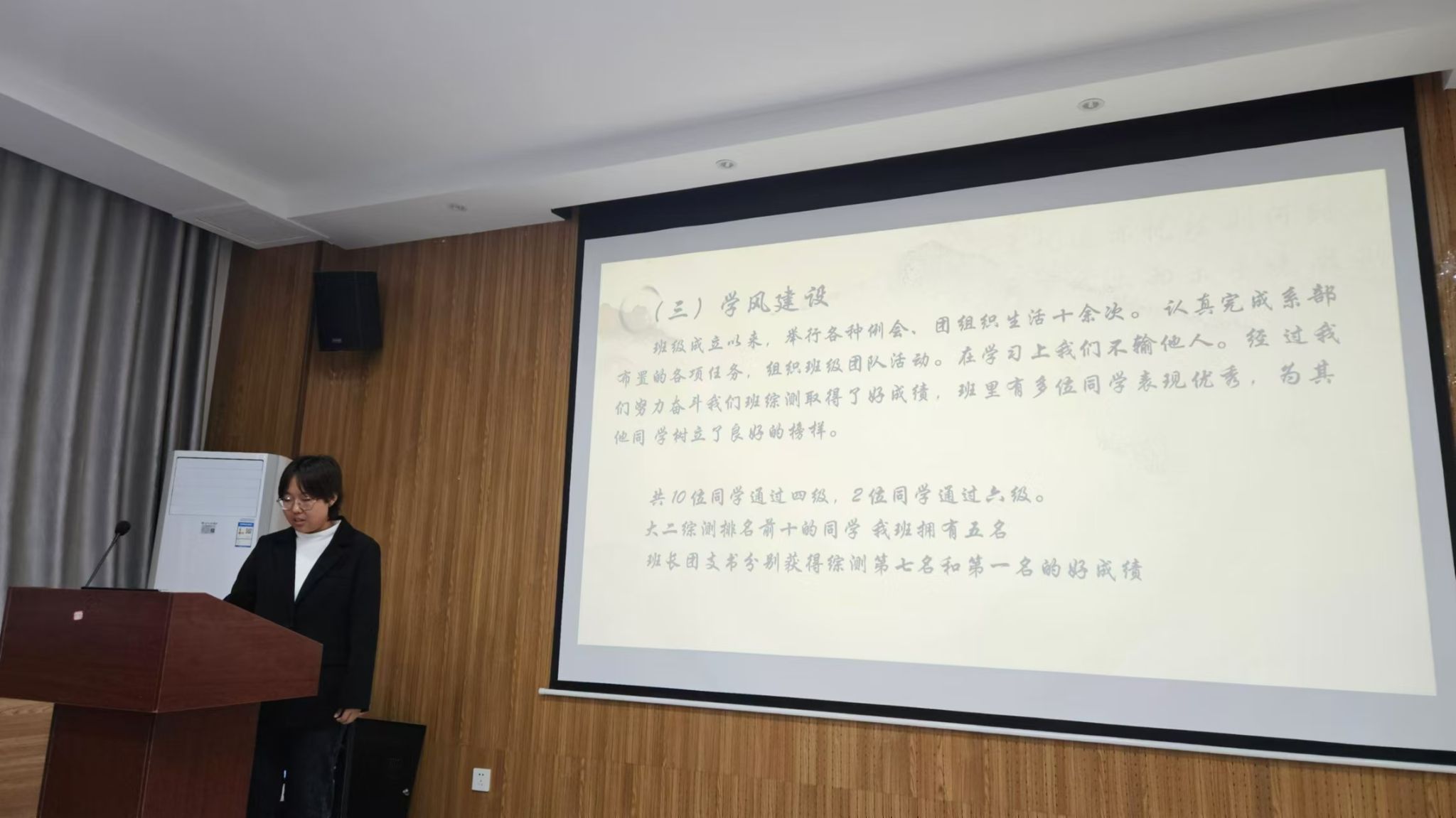 今年共有28个班级申报“优良学风示范班”,经年级推荐,公司审核,从中择优推选了15个班级申报“优良学风示范班”。 各班通过精美PPT展示和讲解,结合本班特点,逐一展示了各自班级学风建设举措和成果,展示了各班同学团结友爱,积极向上精神风貌,现场氛围热烈。