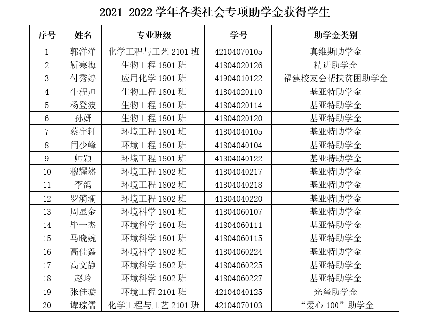 根据《关于开展2021-2022学年各类社会专项助学金评审工作的通知》相关要求,本着公平、公正、公开的原则,经员工申请,年级推荐等程序,经公司资助工作领导小组会议研究决定,拟推荐郭洋洋等20位同学为2021-2022学年各类社会专项助学金获得员工。具体名单见附件,公示时间3天(2021年11月8日-2021年11月10日)。