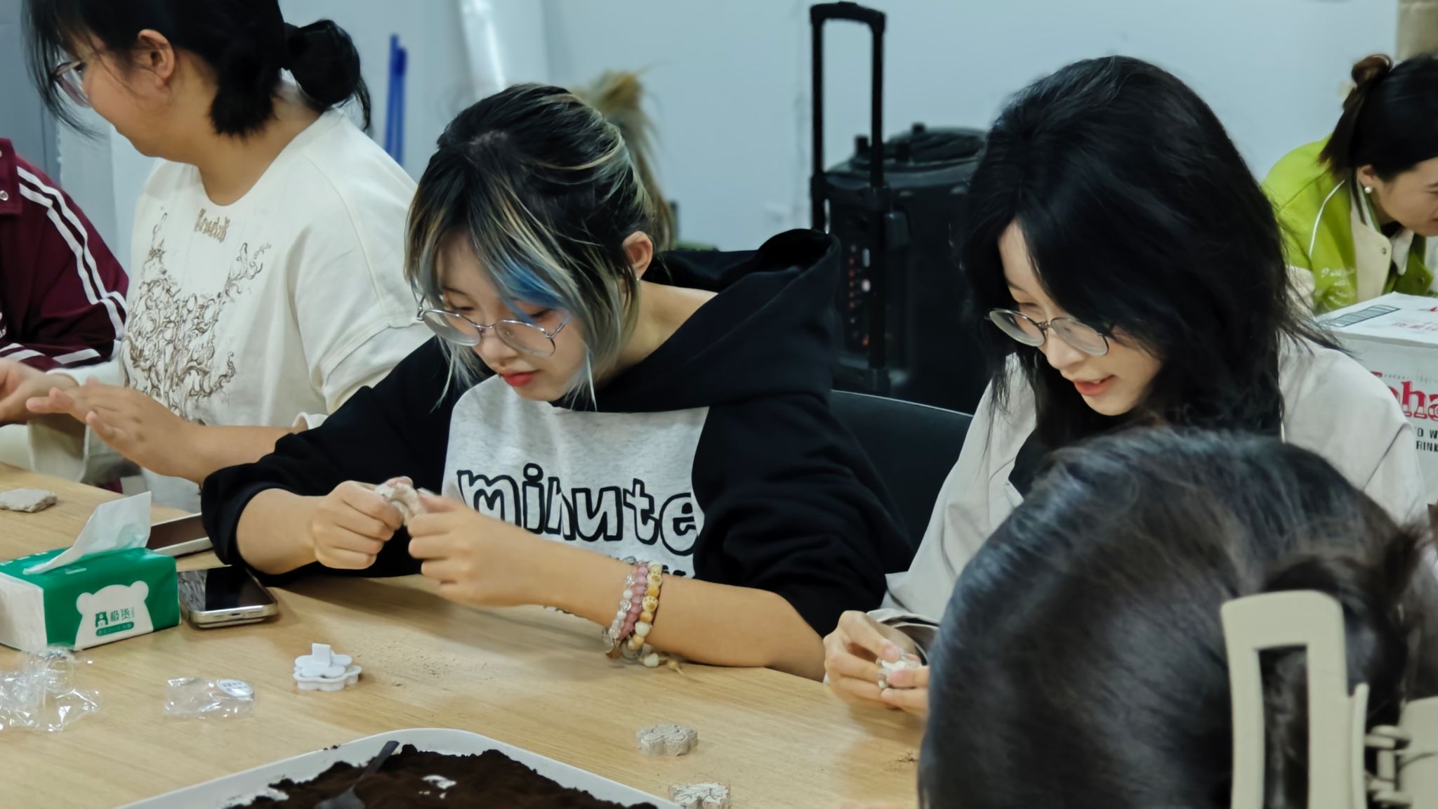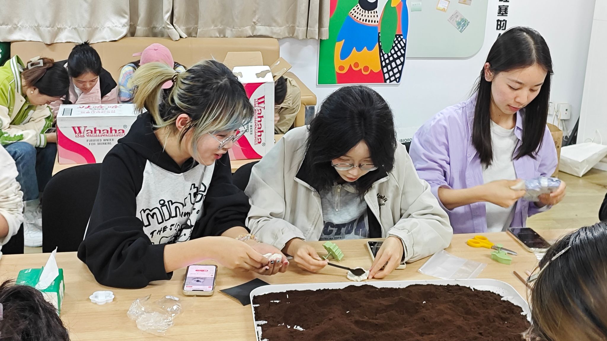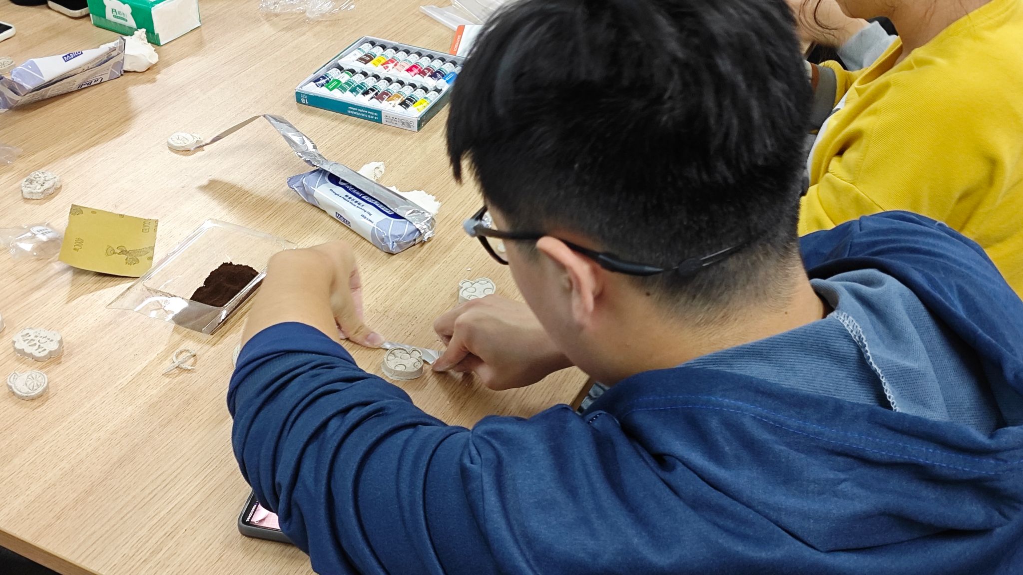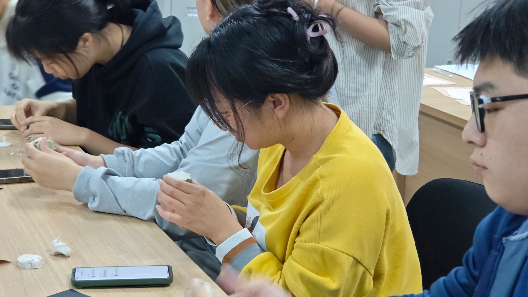随后,盖潇宇细致讲解了咖啡渣和粘土的使用方法、制作技巧和注意事项。在老师的指导下,同学们通过揉捏、塑形、雕刻等步骤,一块块原本不起眼的黏土逐渐变成了形态各异、充满创意的形状。这些作品不仅具有美观的外观,还蕴含着环保的理念,让人在欣赏艺术之美的同时,也感受到了环保的重要性。