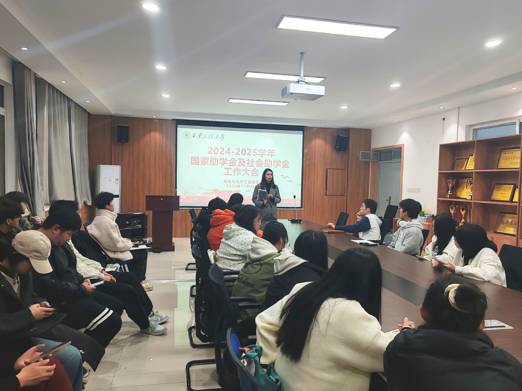 为了进一步加强资助政策宣传力度,规范本科生奖助学金评定程序,夯实资助育人成效,11月6日,公司在环化楼507召开2024年本科生奖助学金评定工作大会,资助专项辅导员盖潇宇,各年级班长、团支书和评议小组代表参加会议。