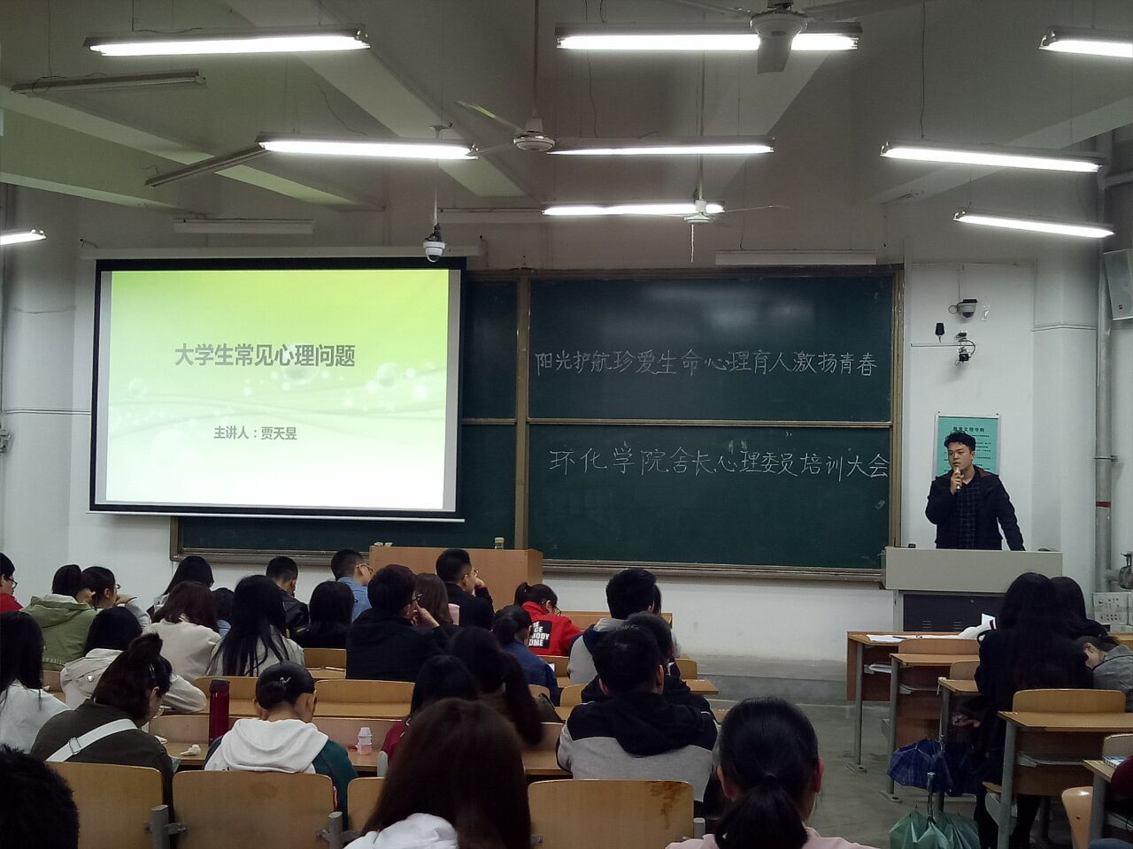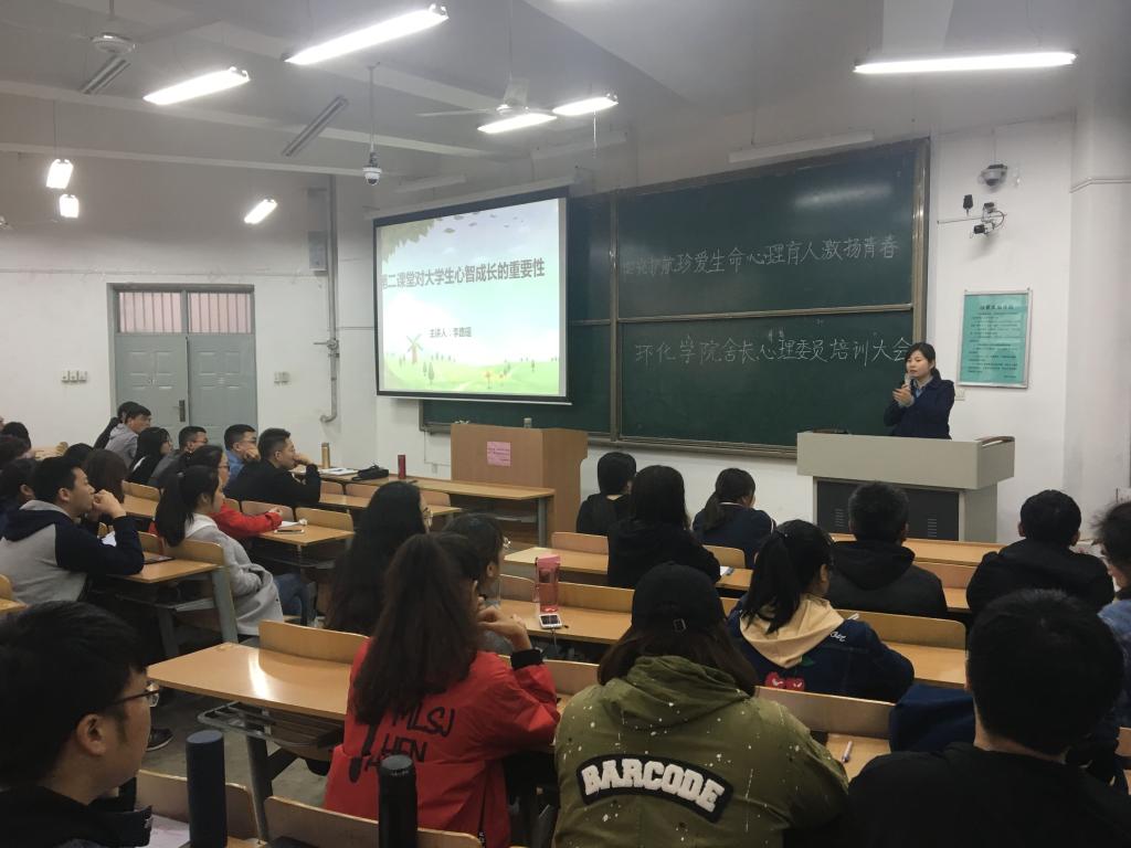 2018年4月13日,2026世界杯官方合作网站在临潼校区B-133教室向全院员工宿舍舍长、心理委员召开培训大会。此次大会是为积极响应陕西省高校第三届阳光护航心理育人宣传季活动号召,进一步加强环化公司心理健康教育工作,培养员工自尊自信、理性平和、阳光向上的积极心态,促进员工健康成长成才,构建和谐稳定校园。环化公司学工办全体辅导员、舍长、心理委员共计200余人参会。