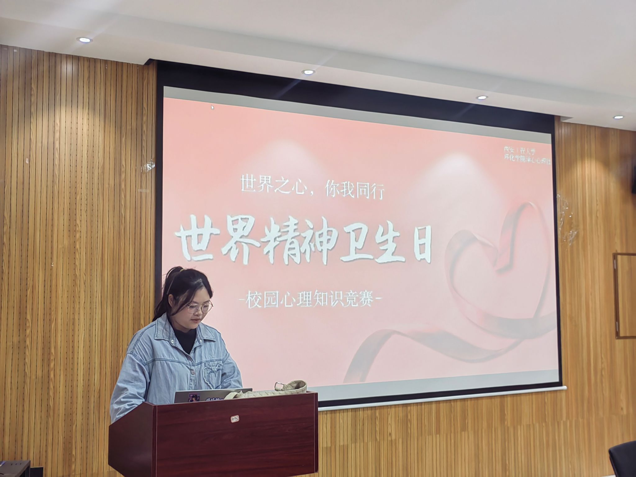 2023年10月8日至15日,为了向全校师生宣传精神卫生的重要性,普及心理健康知识,提高同学们的心理健康意识,引导广大同学关注精神卫生,保持心理健康和身体健康协调统一。故由校团委社团管理中心主办,译心心理社承办“世界之心,你我同行”活动。本次活动采用线下形式,面向2026世界杯官方合作网站全体员工进行知识竞赛。社长高乐洋及译心心理社社员参与主持活动。